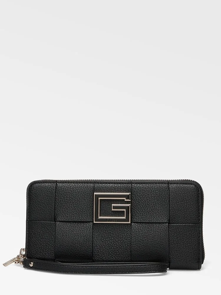 Monedero con muñequera desmontable y cierre de cremallera. 2 bolsillos interiores abiertos, 1 bolsillo con cremallera y 8 ranuras para tarjetas. Bolsillo exterior con cremallera. Herrajes exteriores en tono dorado brillante pálido.