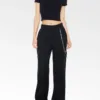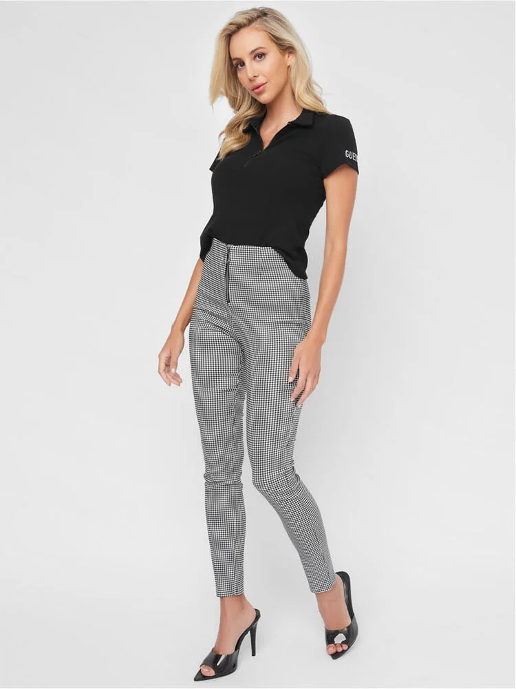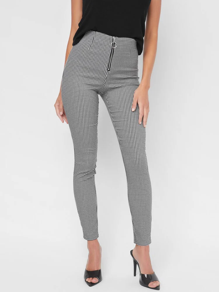 Pantalón casual y coqueto, diseñado en un corte de talle alto con un patrón de cuadros blancos y negros, ceñido al cuerpo. Unido a el, un cierre alto con detalle de circulo metálico.