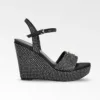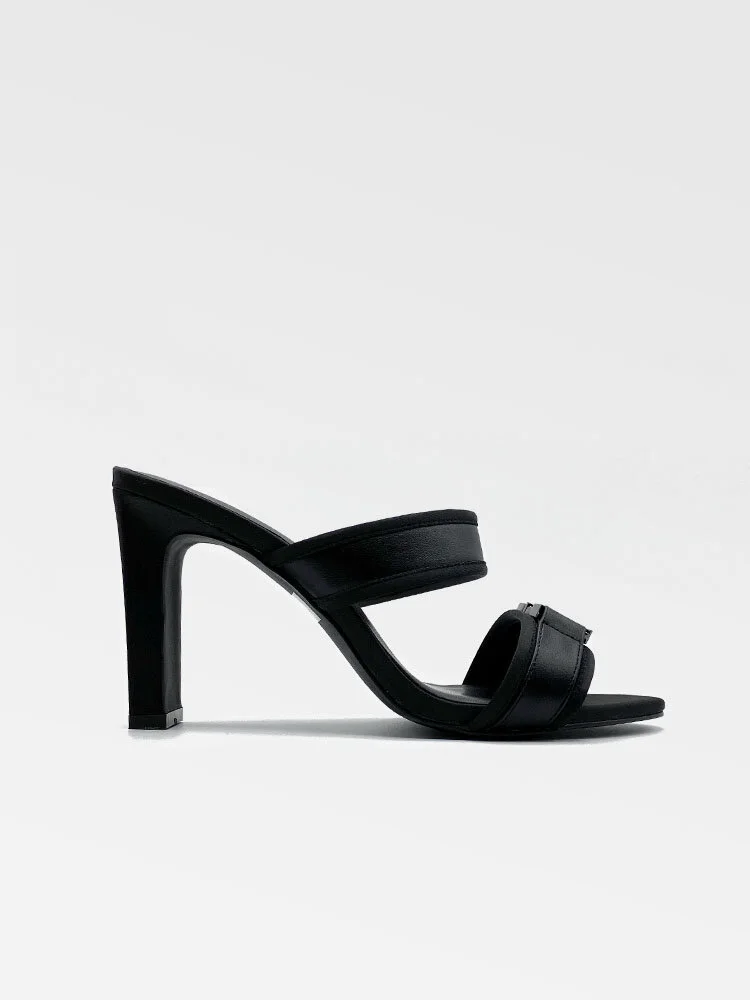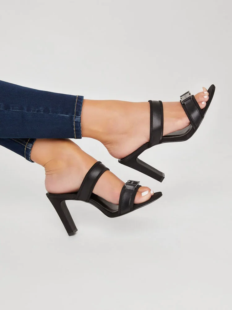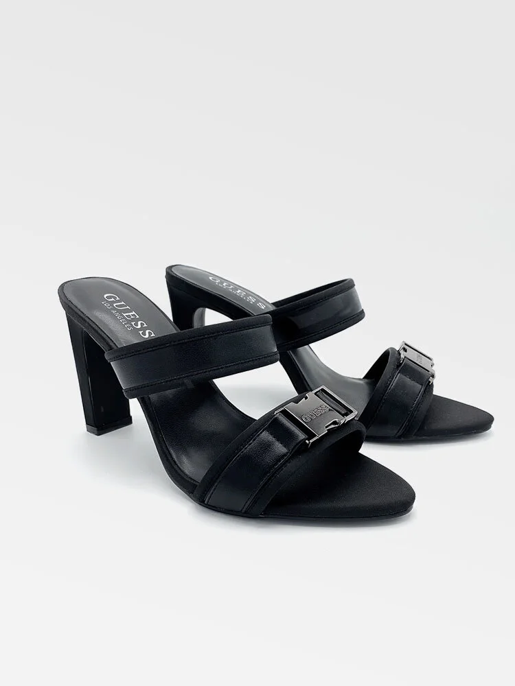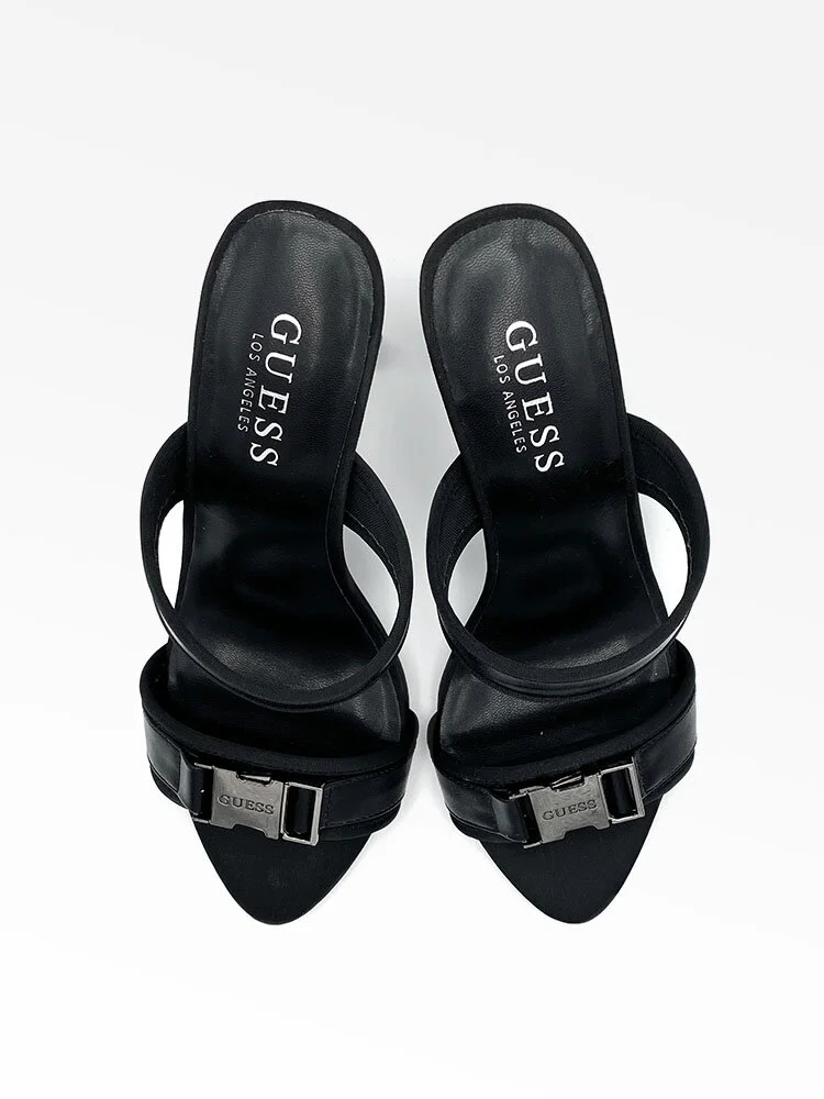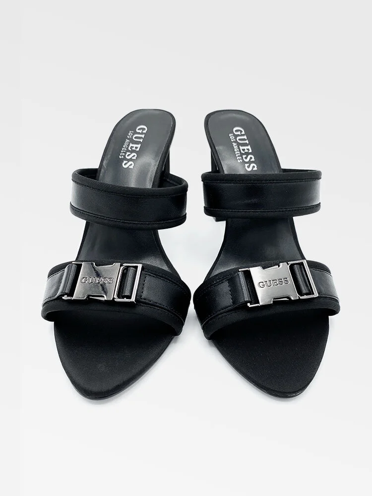 Tacones gruesos abiertos con tiras de tela y cuero. Unida a la parte frontal un lindo adorno con un detalle de hebilla con el logo.