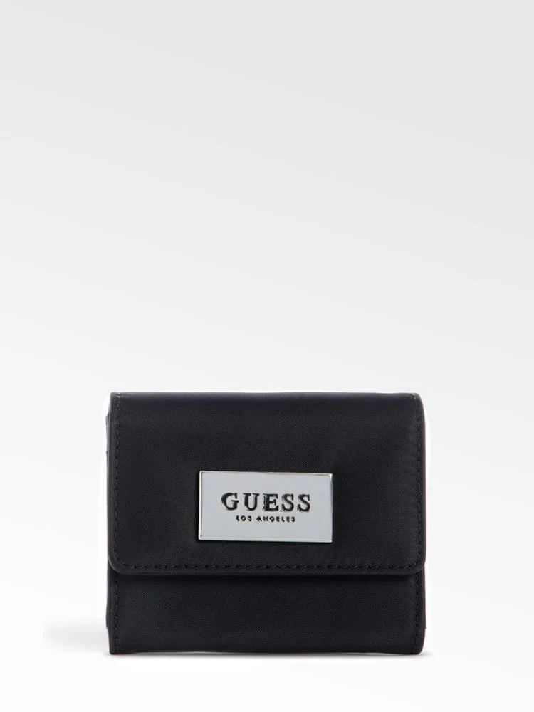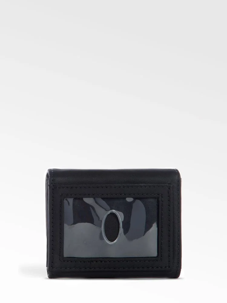 Tarjetero informal de nailon diseñado con una placa con el logotipo en el exterior, cierre con solapa plegable y ventana de identificación en la parte posterior.