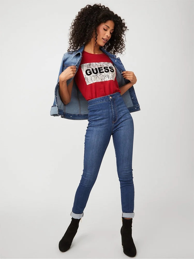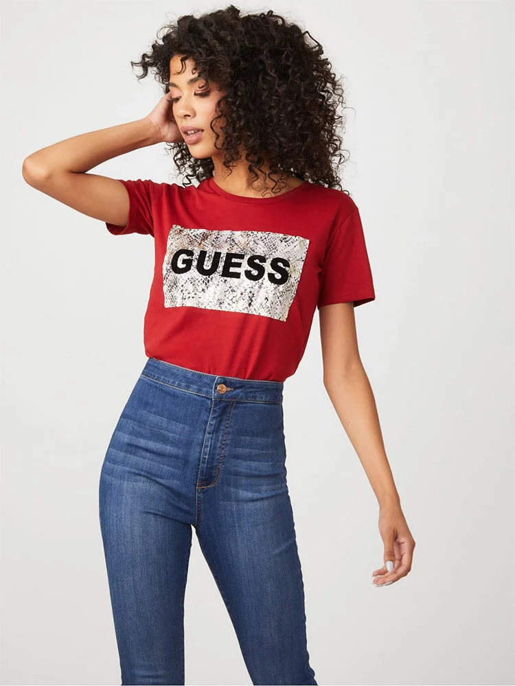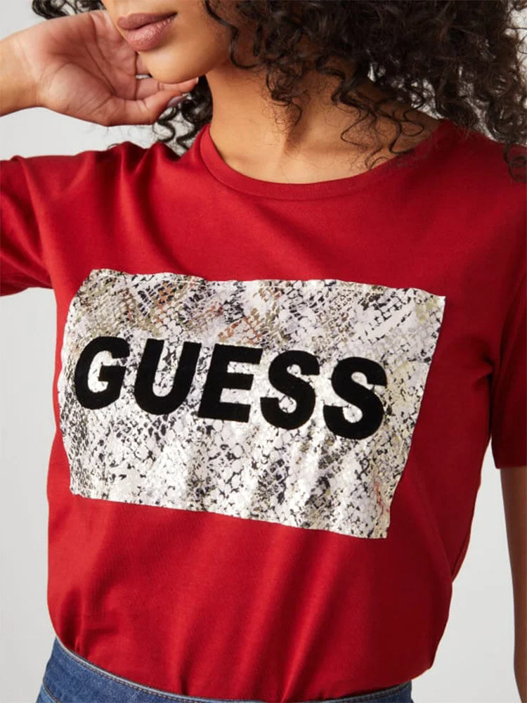 Camiseta manga corta, de cuello redondo de ajuste fácil con un panel estampado de piel de serpiente con detalles metálicos y logo con letras de terciopelo en relieve.