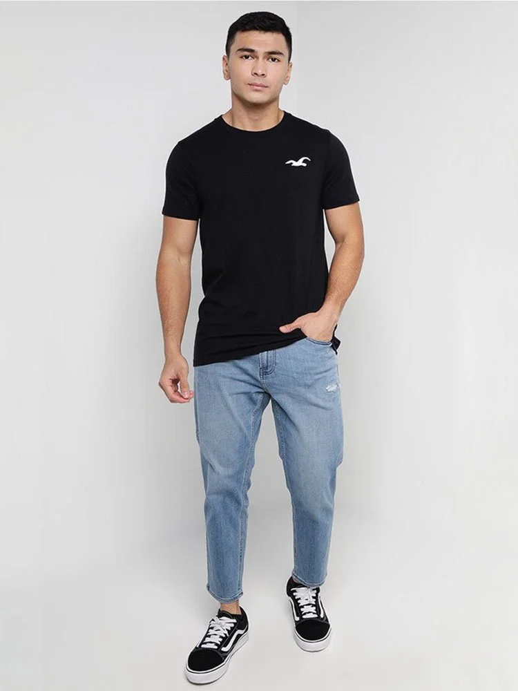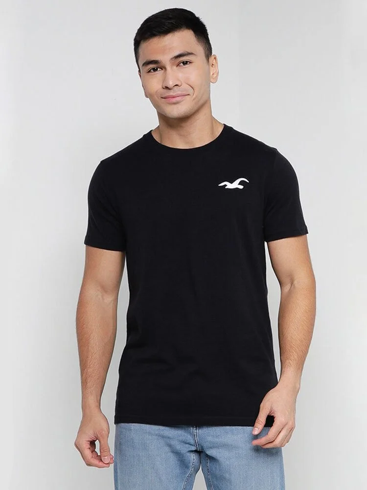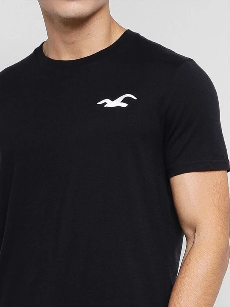 T-Shirt de la marca Hollister con cuello redondo, manga corta y logo bordado en el pecho.