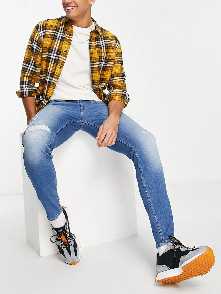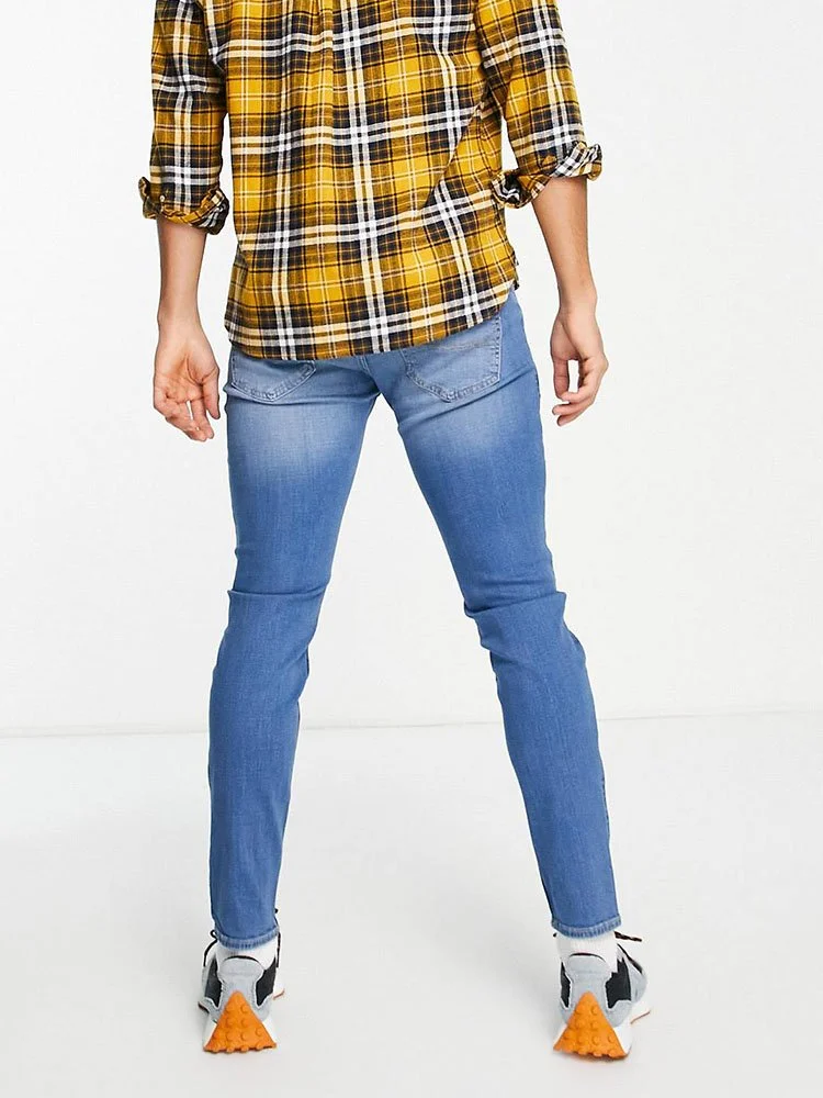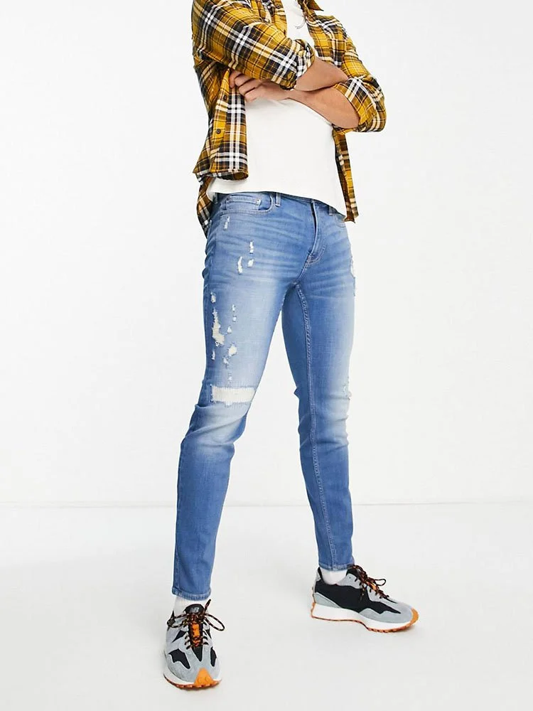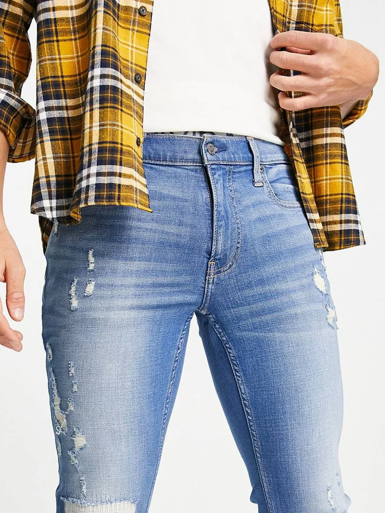Jeans para caballeros, con corte súper skinny, acabado envejecido, tiro normal y cinco bolsillos.