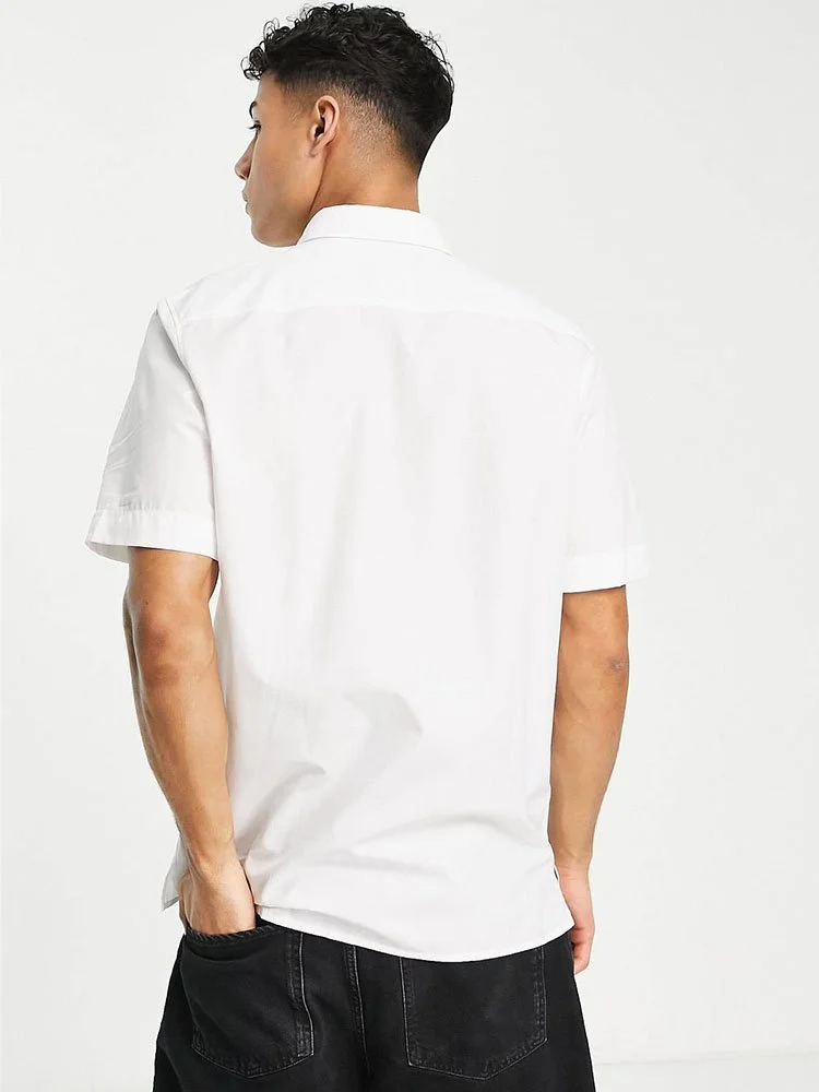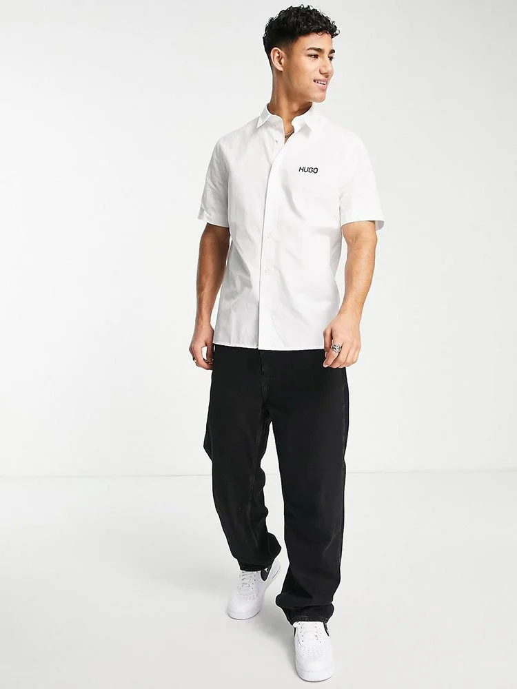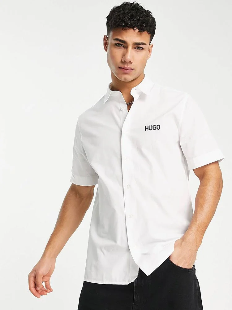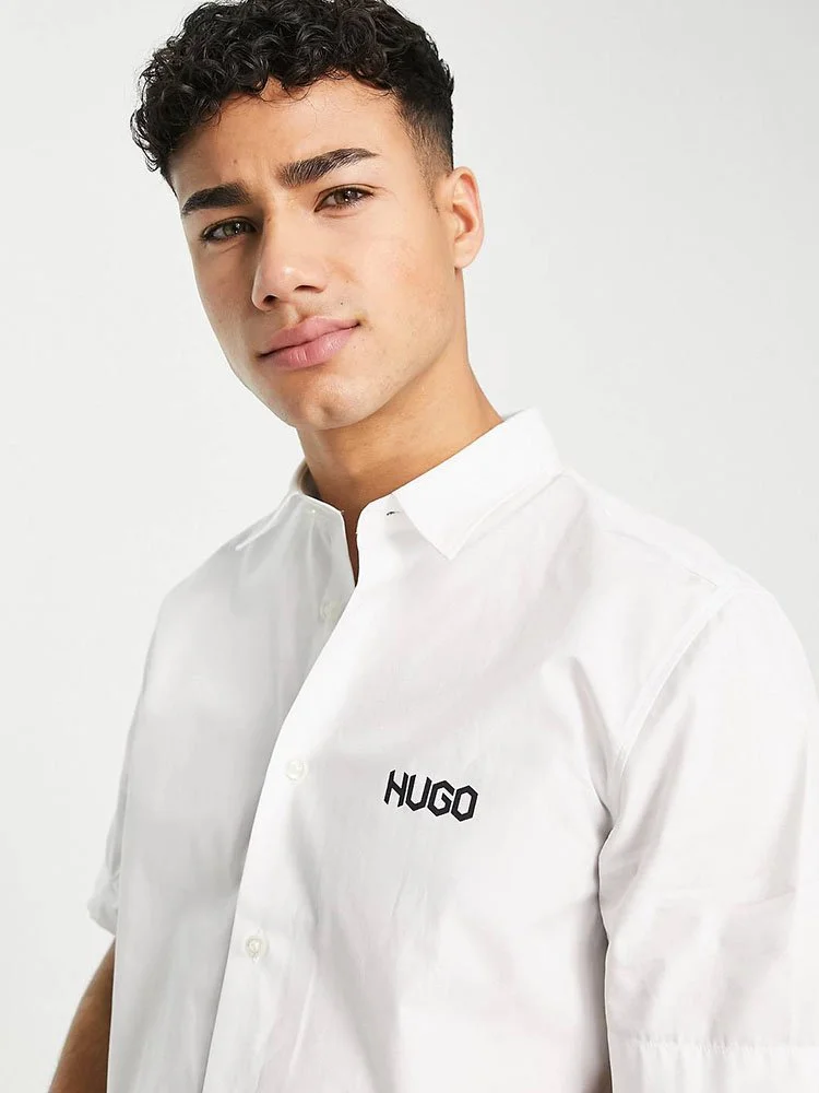 Camisa para caballeros de la marca Hugo Boss, con cuello italiano, con botones, estampado en contraste en el pecho y manga corta.