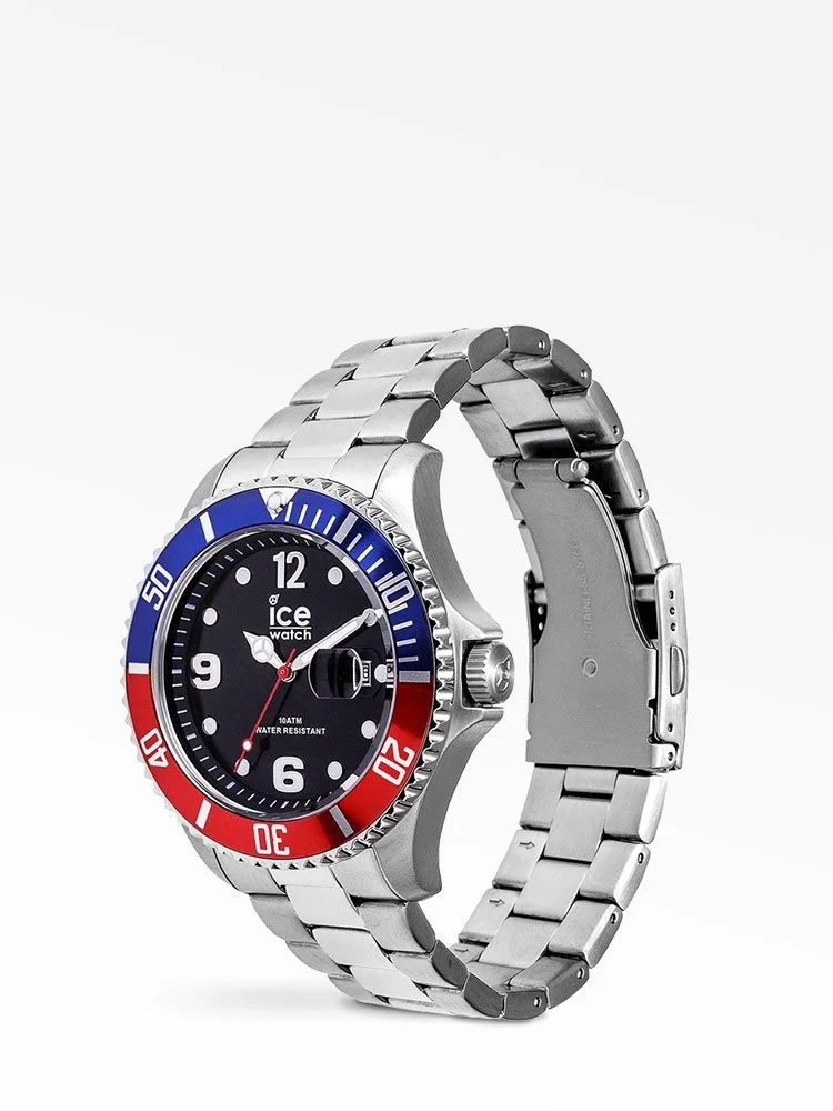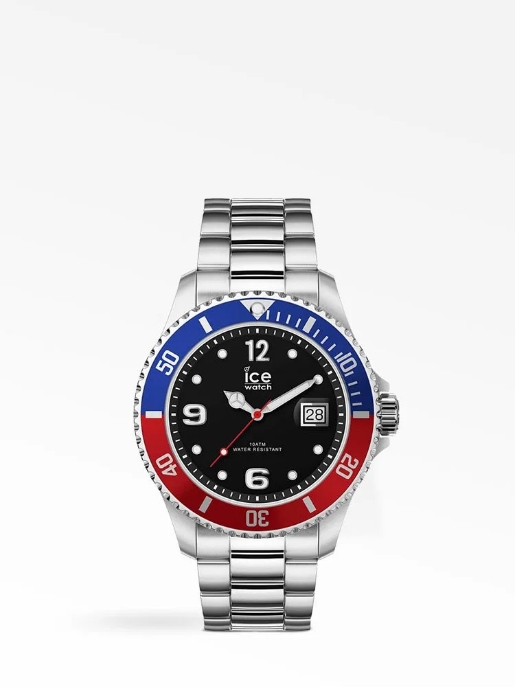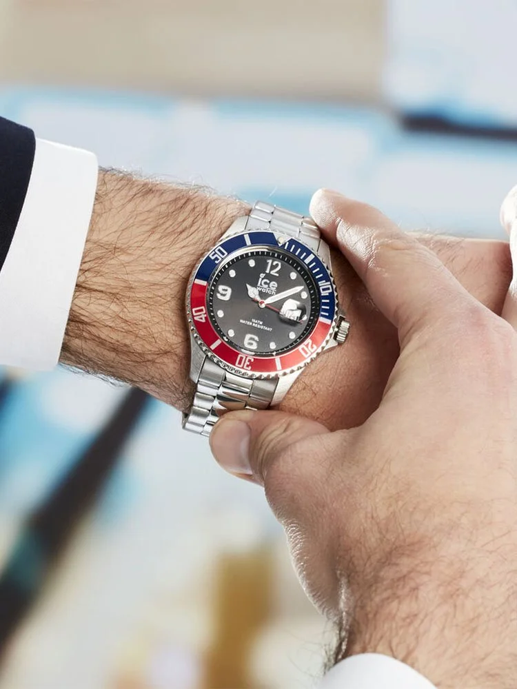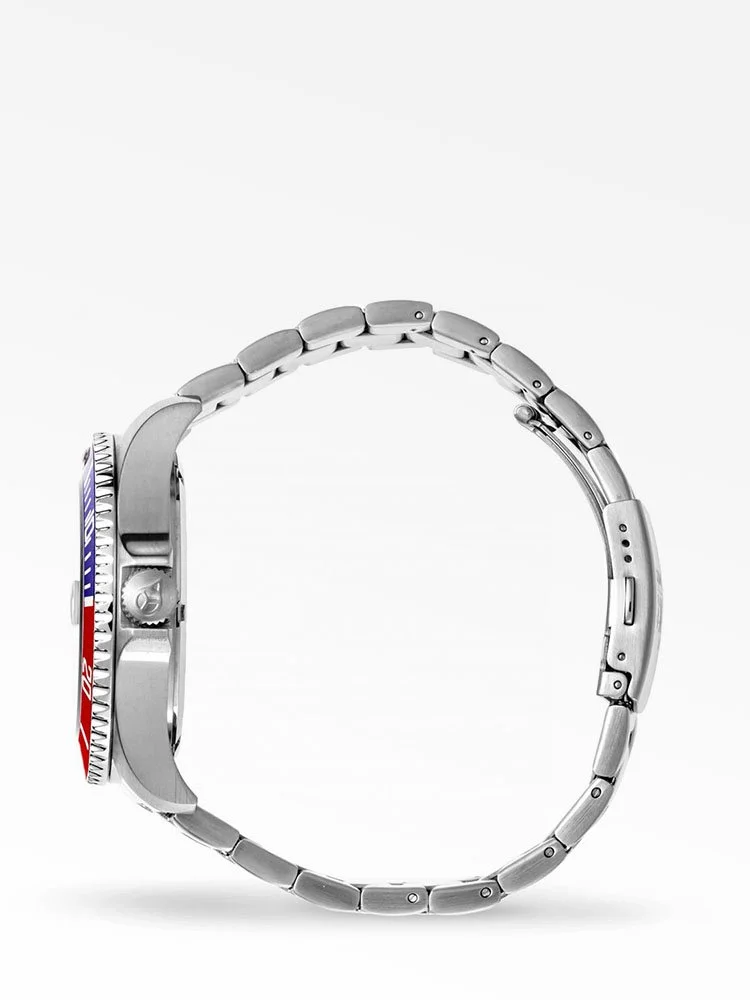 Elegante y robusto, este reloj de acero le da un estilo especial a cada día. Con su esfera azul y rojo (Pepsi), bordeo con detalles blancos y su pulsera metálica, este reloj dará un toque moderno y colorido a su brazo.