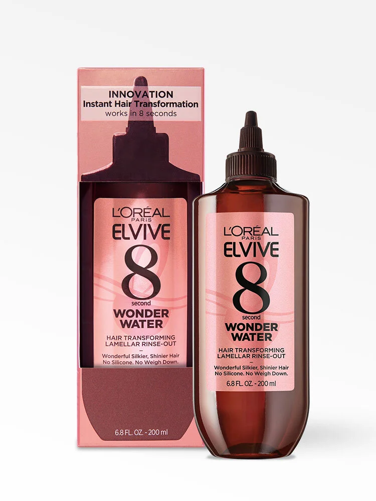 Elvive 8 segundos agua maravilla por L’Oreal Paris, este tratamiento de cabello hidratante lamelar transforma el cabello en 8 segundos para un cabello más sedoso, brillante y saludable.