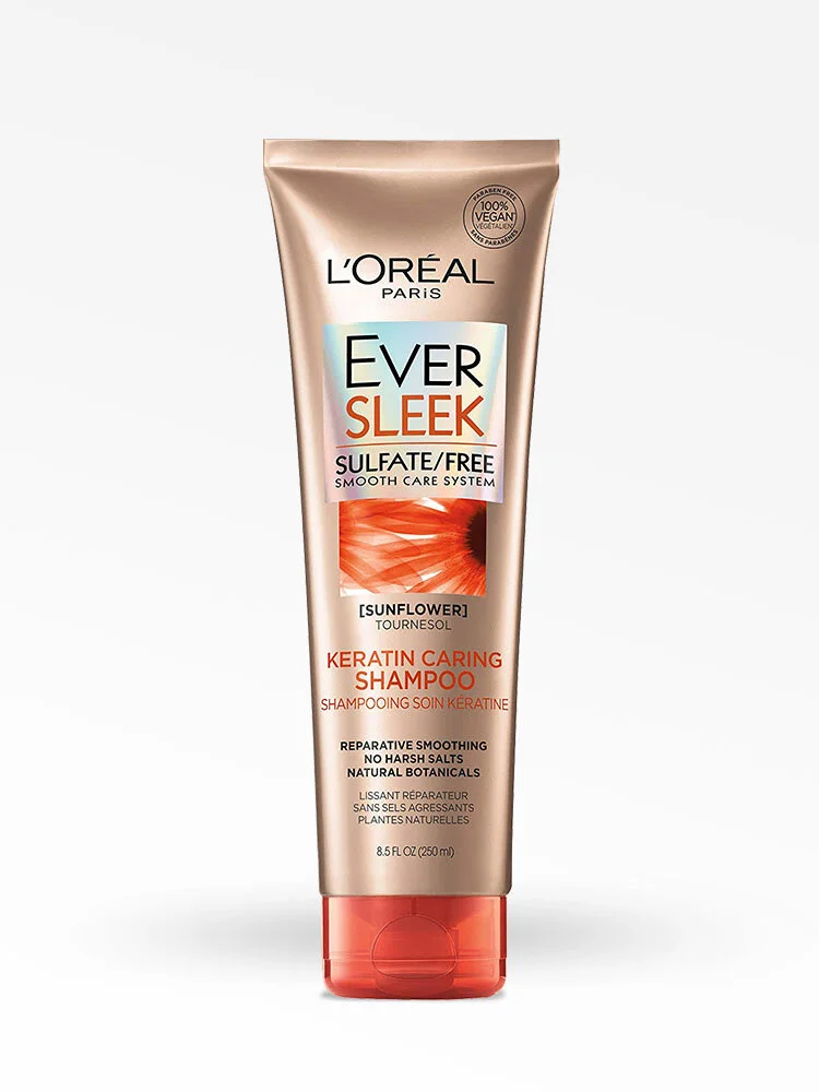 Shampoo Ever Sleek de L’Oréal Paris, con fórmula hecha con ingredientes botánicos nutre, suaviza y mejora la textura del pelo. Enriquecido con aceite de girasol que ayuda a eliminar el frizz. Sin sulfatos, sin parabenos, sin colorantes, 100% vegano. Completa tu rutina utilizando el shampoo, acondicionador y Serum.