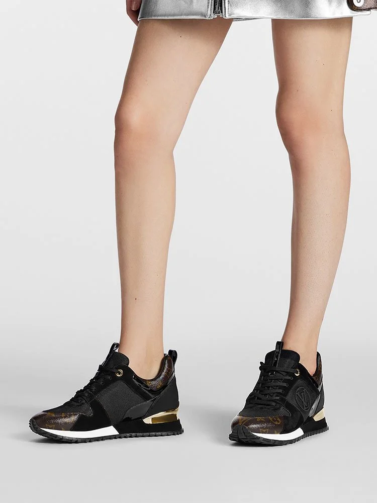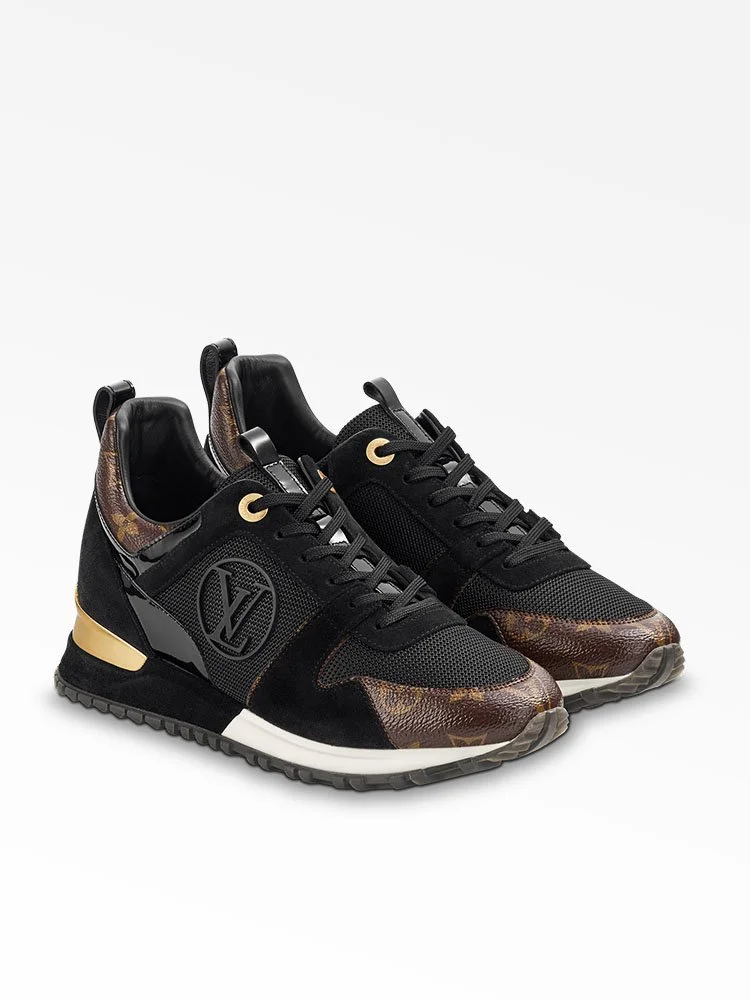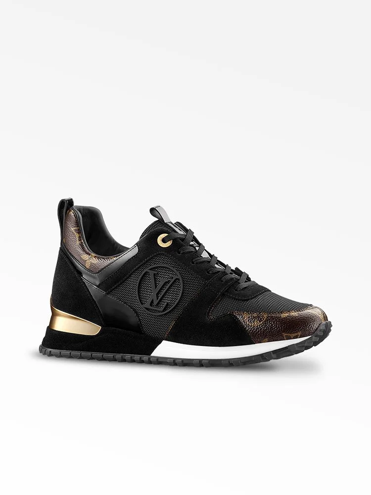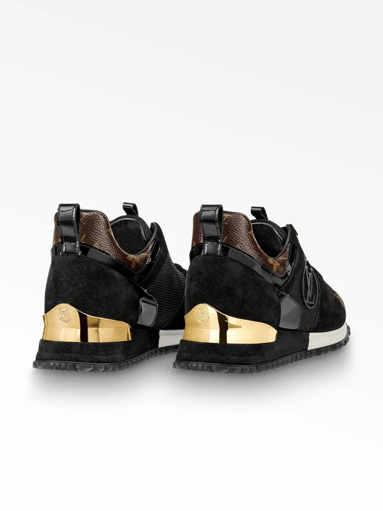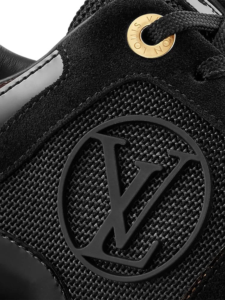Una firma LV circular extragrande engalana el lateral de la zapatilla deportiva Run Away de ante de becerro negro o blanco con característicos adornos de lona Monogram. Este diseño avanzado posee una suela técnica con una cuña de elevación oculta y un atractivo estabilizador de metal dorado.