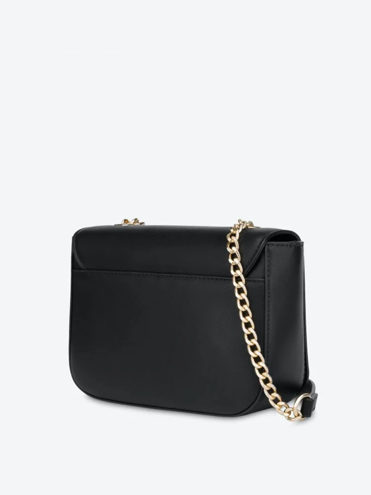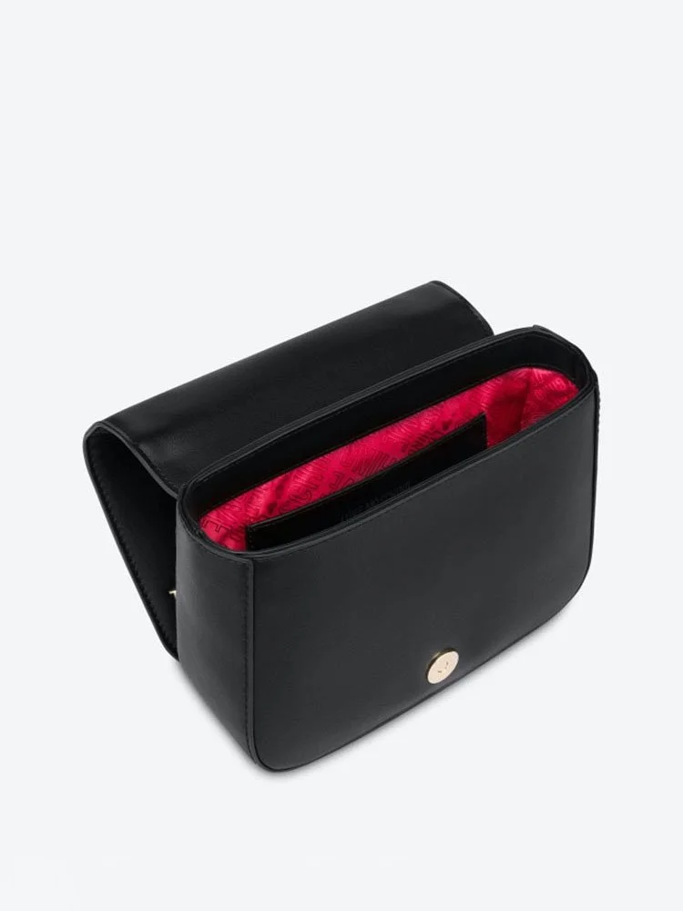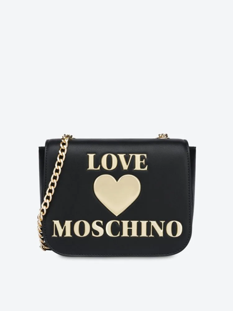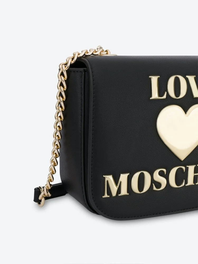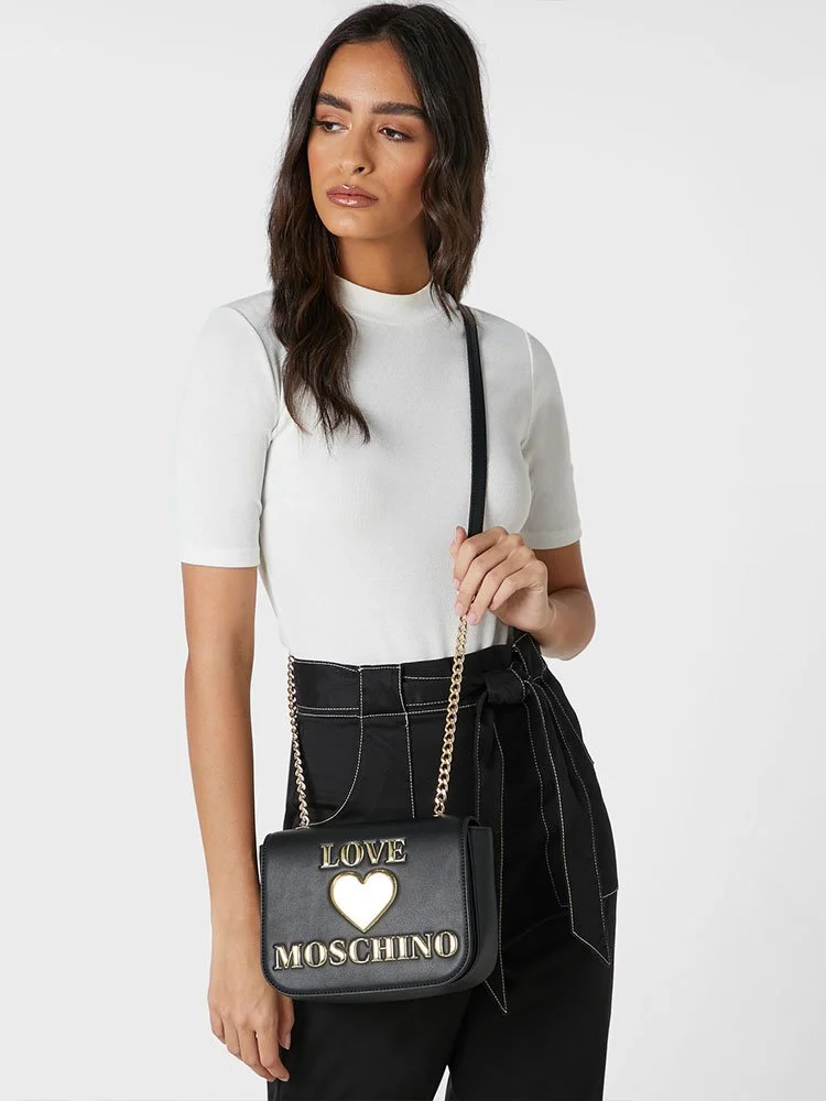 Bandolero tamaño regular, de material rígido, con diseño de corazón, logo acolchado y laminado, bandolera de cadena con protector de hombro e interior forrado con bolsillo de parche.