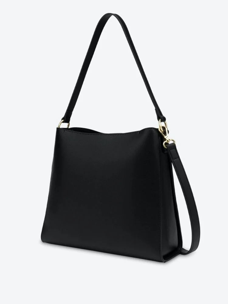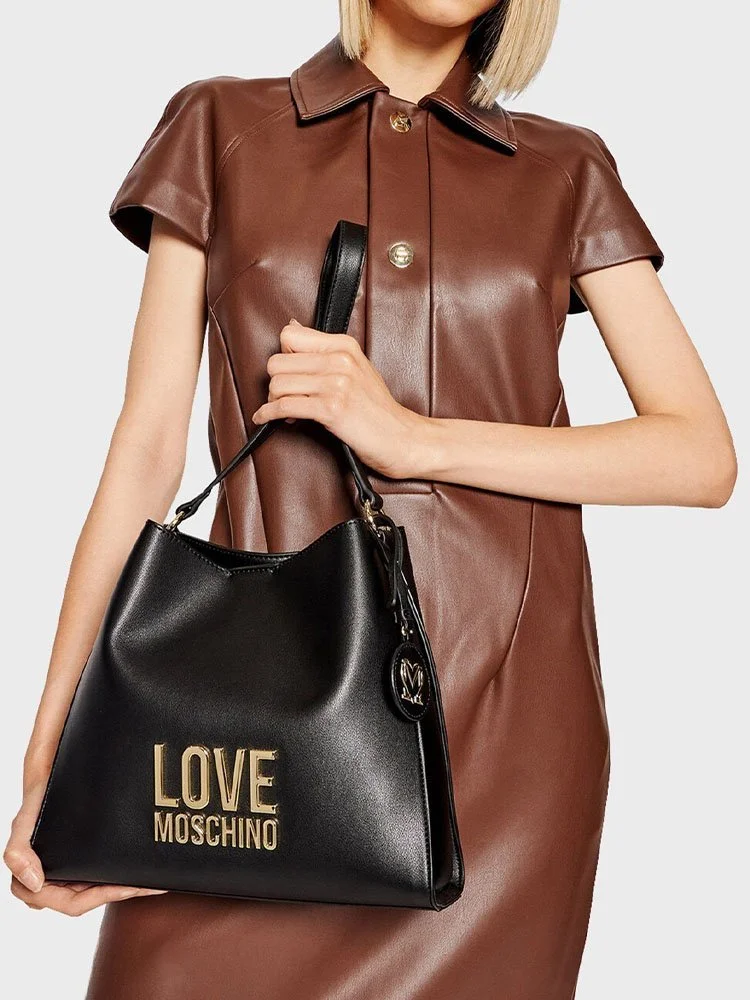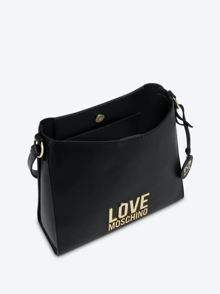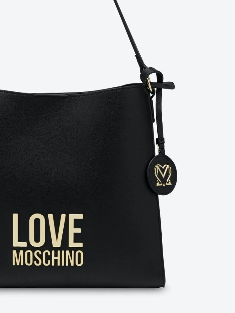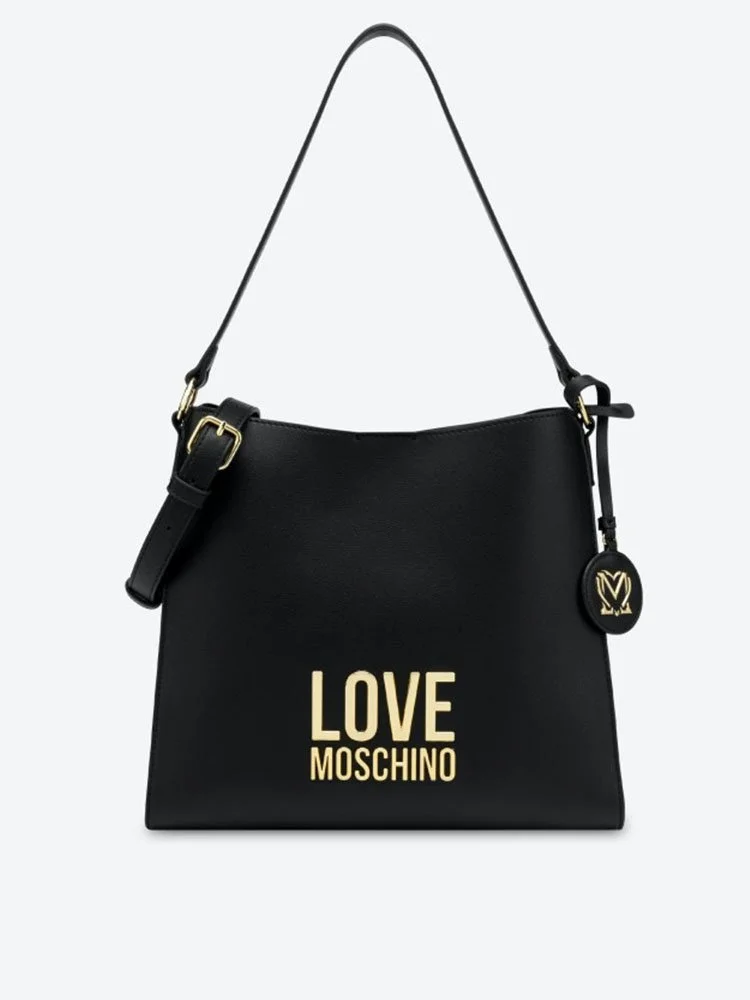 Bolso MOSCHINO con logo galvánico dorado aplicado en la parte delantera, charm extraíble con logo, bandolera ajustable con hebilla, cierre magnético y bolsillo interior.