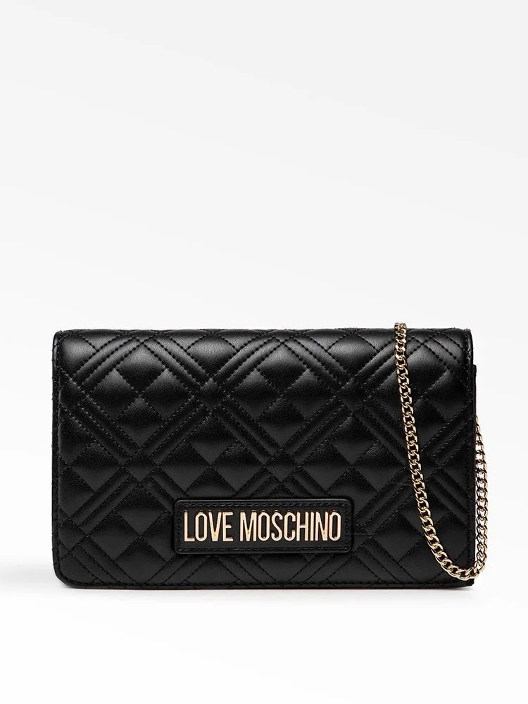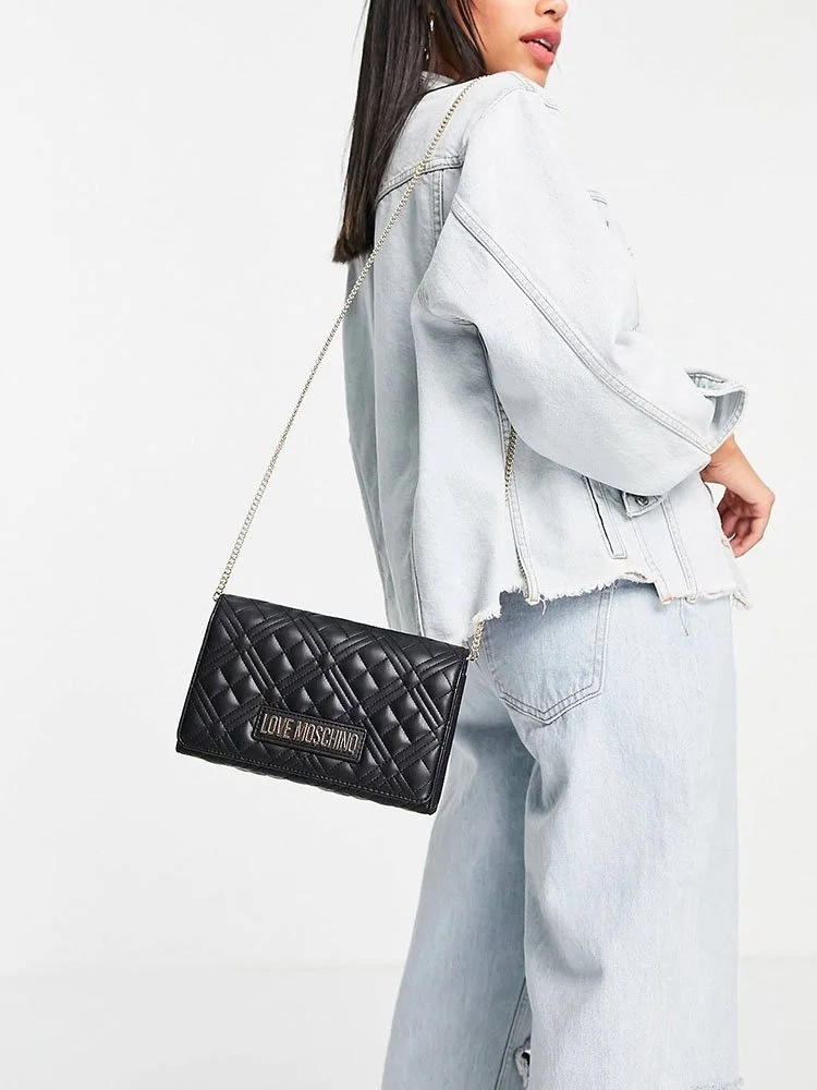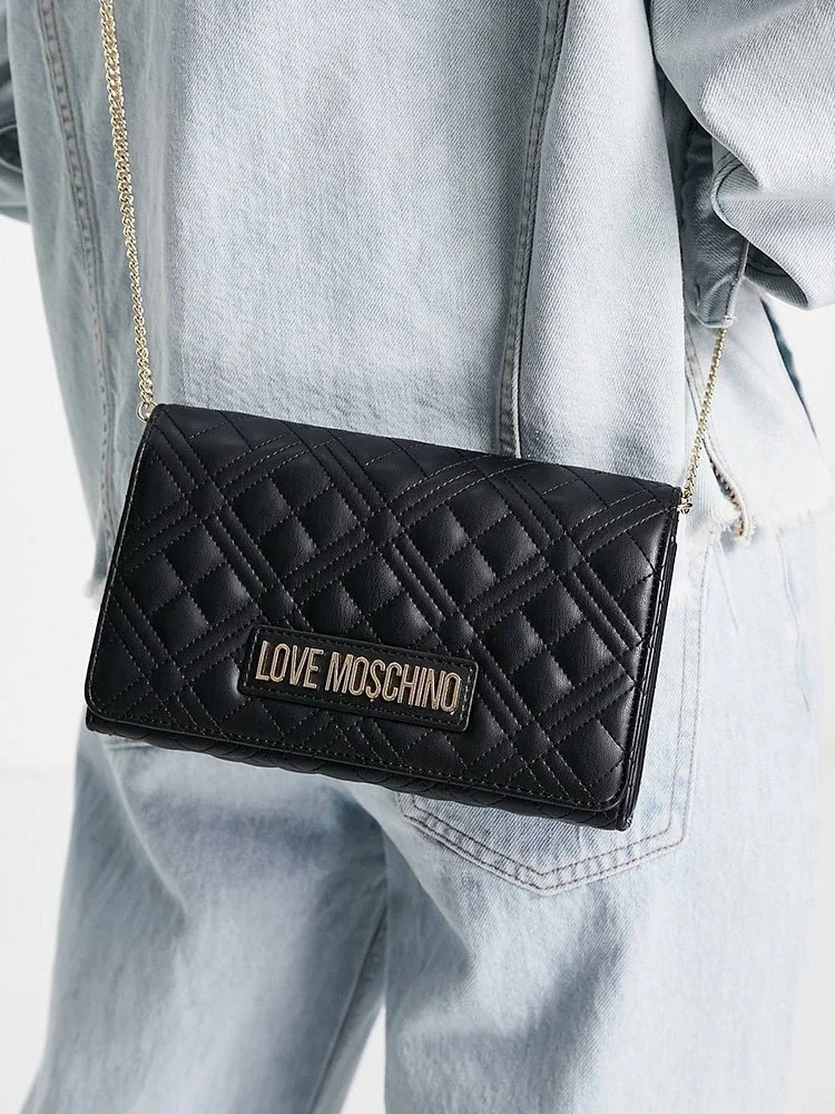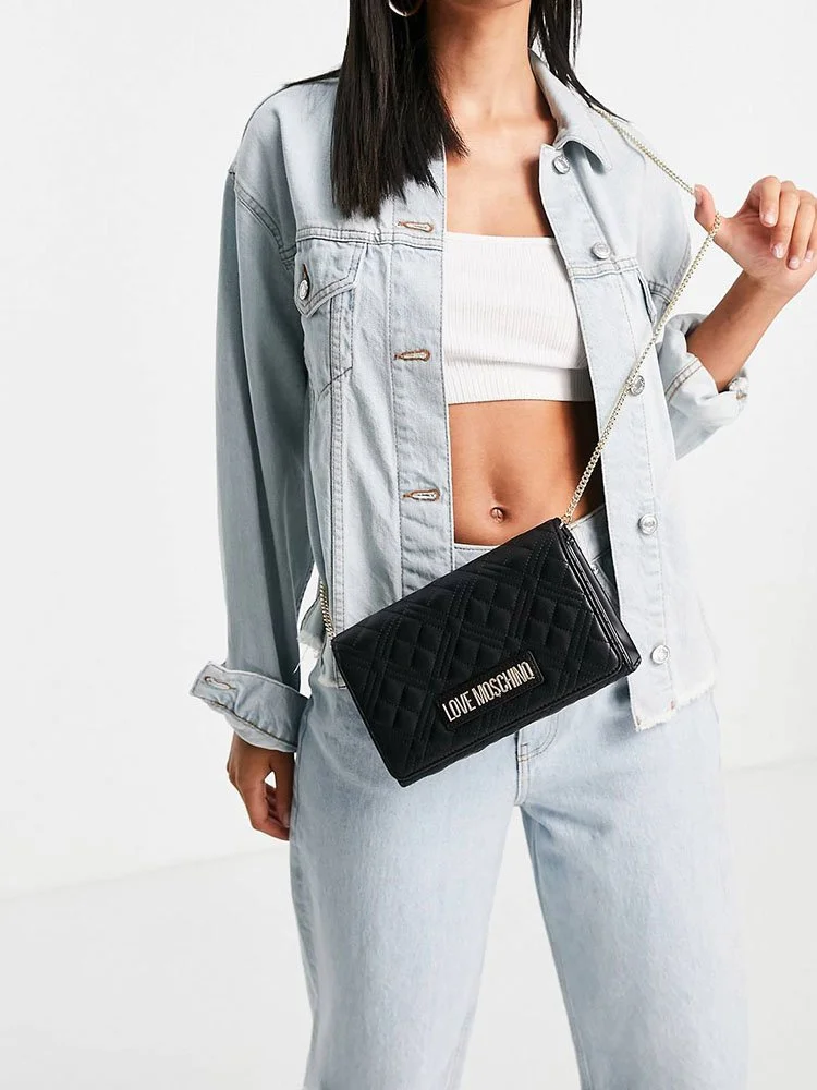 El bolso bandolera de la línea Love de la afamada marca Moschino, rinde homenaje al amor de la marca por los logotipos. Esta iteración de efecto matelassé está elaborada en cuero, con agarre de cadena fina y decorada únicamente con la brillante firma dorada de la marca que resalta sobre el fondo negro.