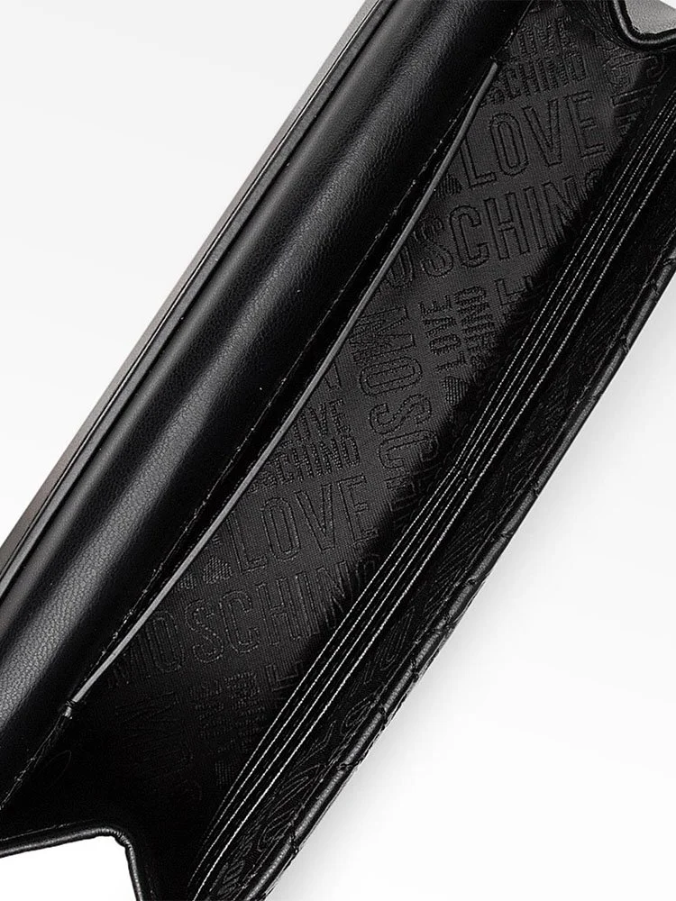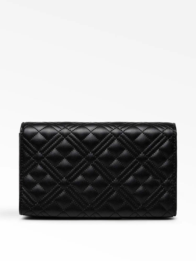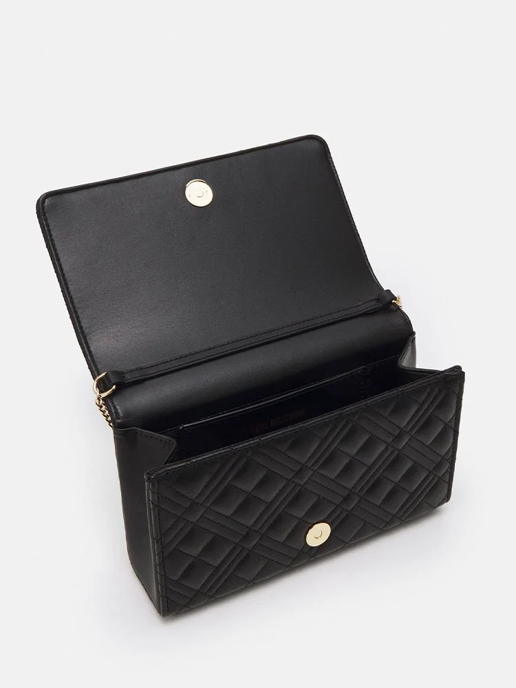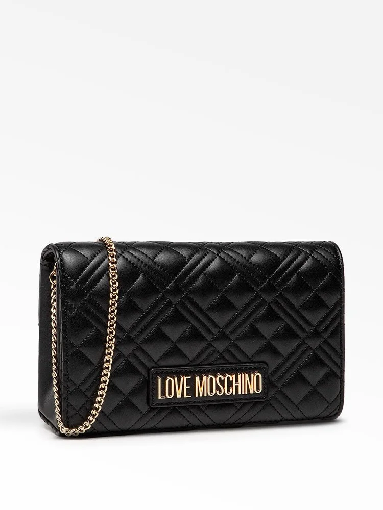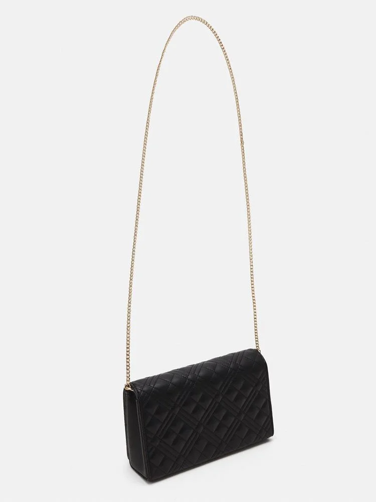 El bolso bandolera de la línea Love de la afamada marca Moschino, rinde homenaje al amor de la marca por los logotipos. Esta iteración de efecto matelassé está elaborada en cuero, con agarre de cadena fina y decorada únicamente con la brillante firma dorada de la marca que resalta sobre el fondo negro.