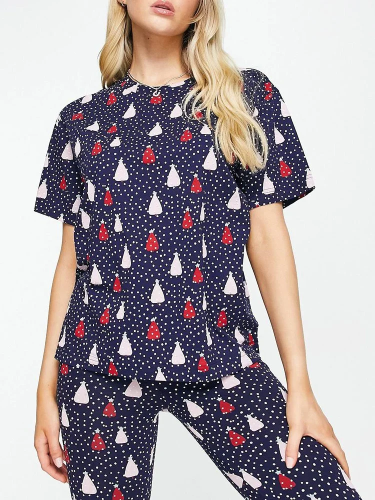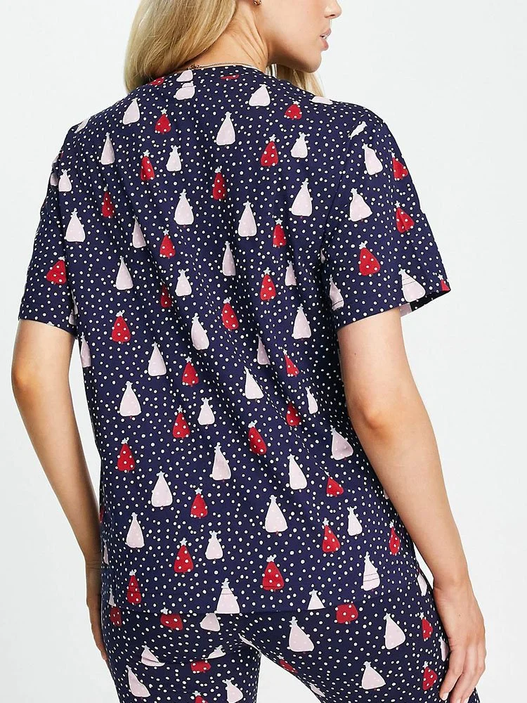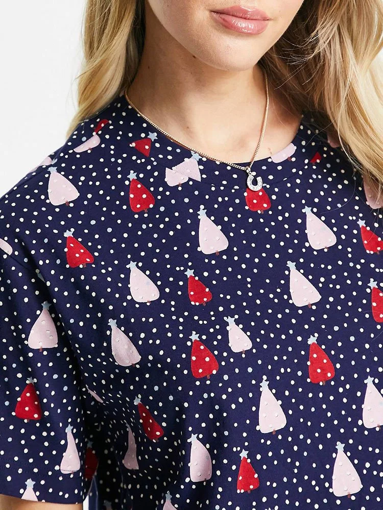 Top de pijama con estampado de árboles de Navidad, cuello redondo, manga corta, largo crop y corte regular.