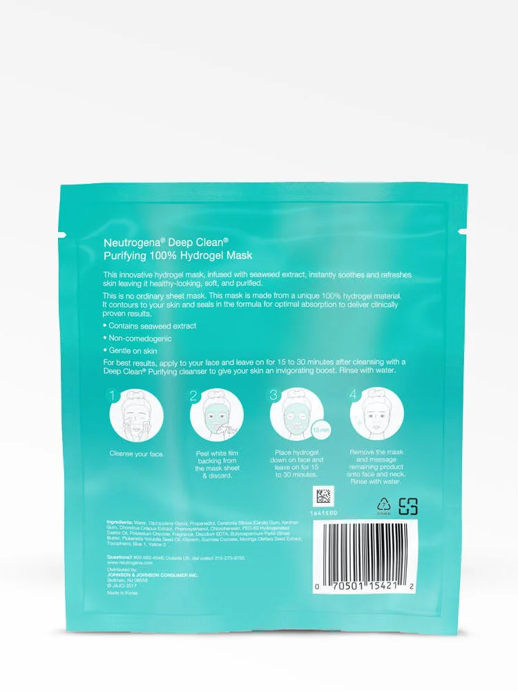 Su diseño con 100% Hydrogel permite que se adapte a tu piel y favorece una óptima absorción de la fórmula, con lo cual aporta a tu cutis resultados clínicamente comprobados. Esta máscara facial purificadora es de fórmula delicada para tu piel y tiene extracto de algas marinas, que purifica tu cutis y le da una apariencia saludable. Si deseas darle a tu piel una buena dosis de vitalidad, usa la máscara facial después de la rutina de limpieza con un limpiador de la línea DEEP CLEAN® Purifying. Aplica la máscara de gel en tu rostro y déjala actuar durante 15 a 30 minutos. Retira la máscara y masajea las áreas del rostro y el cuello para que el contenido restante de la máscara penetre en tu piel; luego, enjuaga con agua. La máscara purificadora NEUTROGENA® DEEP CLEAN® Purifying 100% Hydrogel Mask es no comedogénica.
