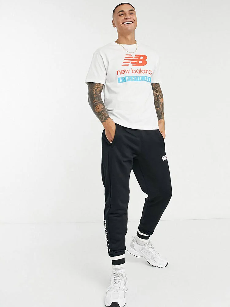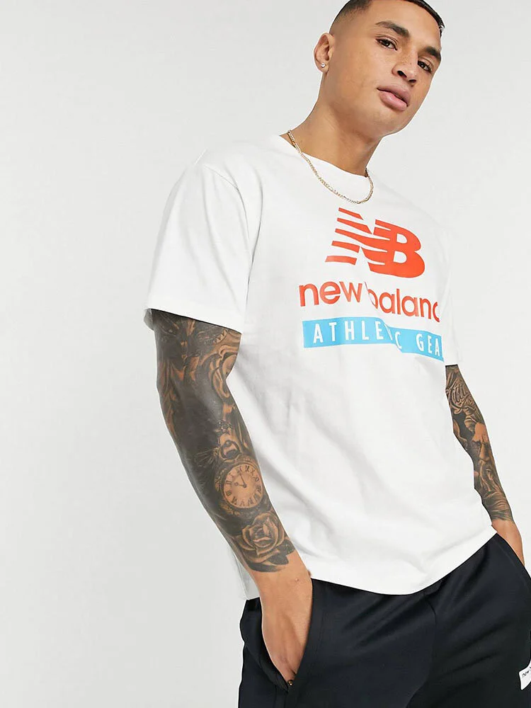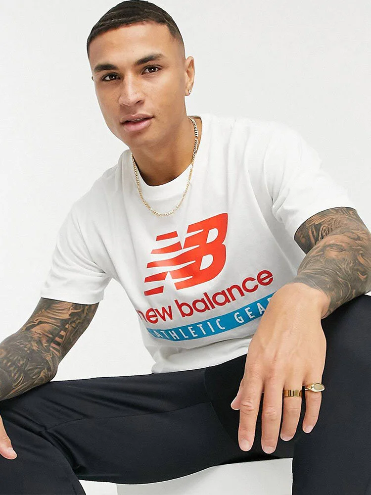 T-Shirt deportiva de New Balance con un logotipo clásico estampado en la parte delantera. Hecho en algodón con manga corta y corte regular con cuello redondo.