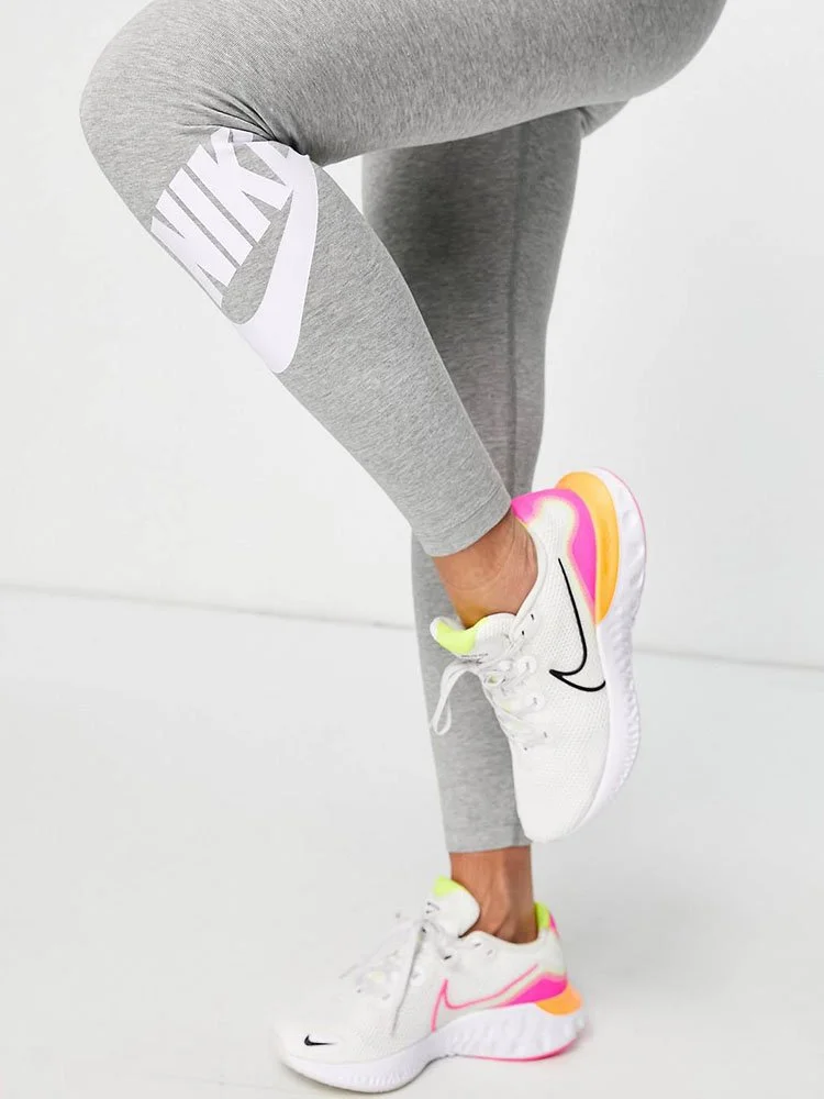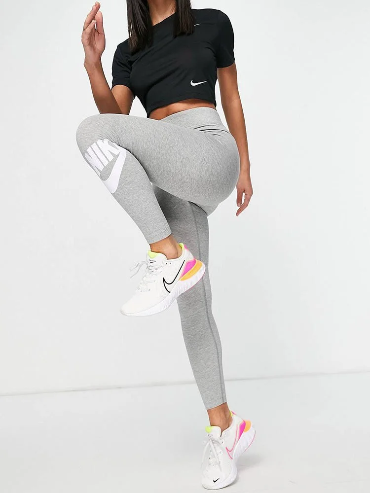 Leggings de la marca Nike con tiro alto, cintura elástica y logo de Nike estampado en el tobillo.
