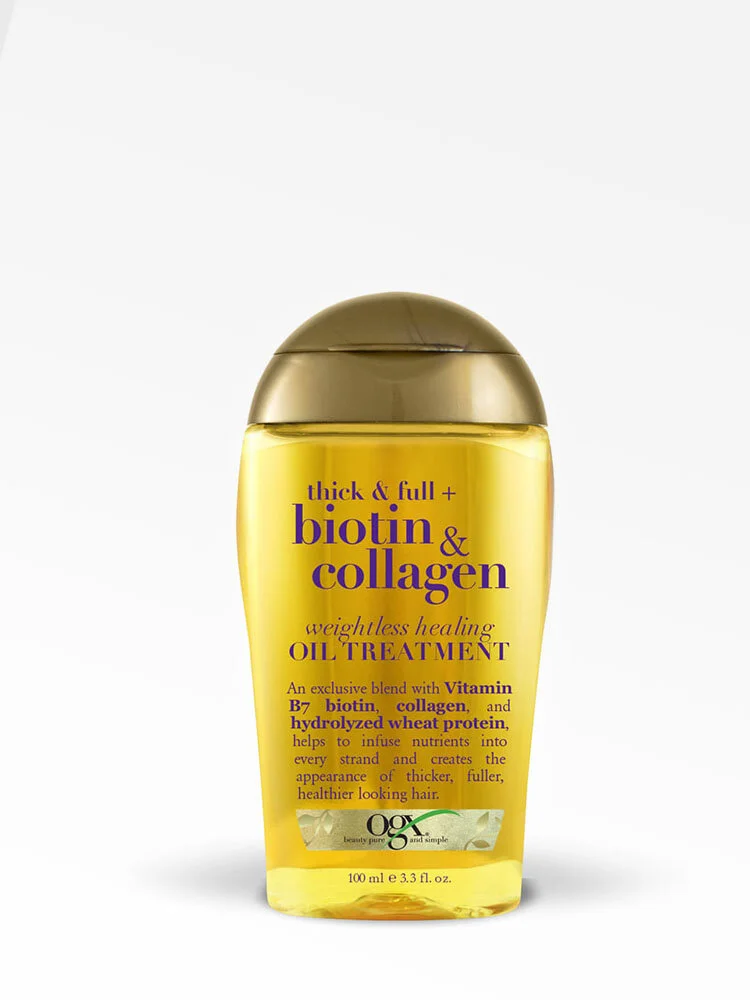 Este aceite ligero/tratamiento tiene una doble función. Protege y cura hebras cansados de pelo, mientras se les infunde con un brillo radiante. Cuenta con vitamina B7 biotina y colágeno.