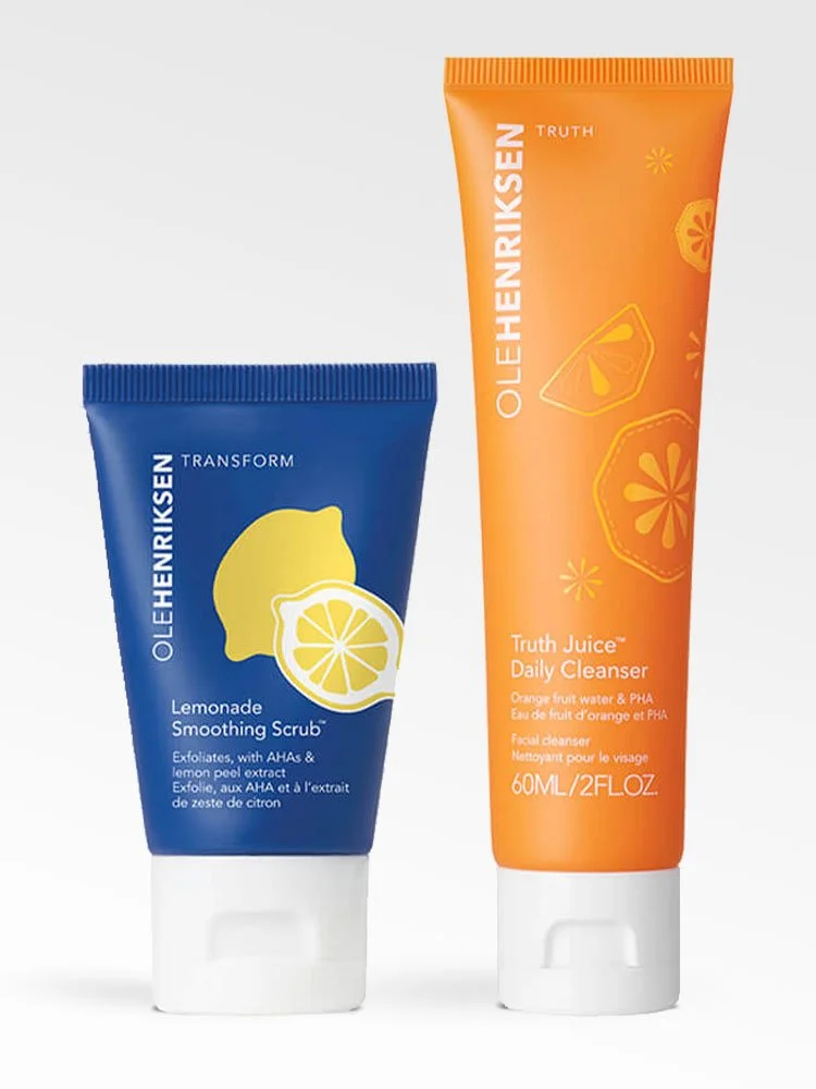 Un dúo para el cuidado de la piel de tamaño viajero para una piel fresca: un limpiador energizante y un exfoliante retexturizante.