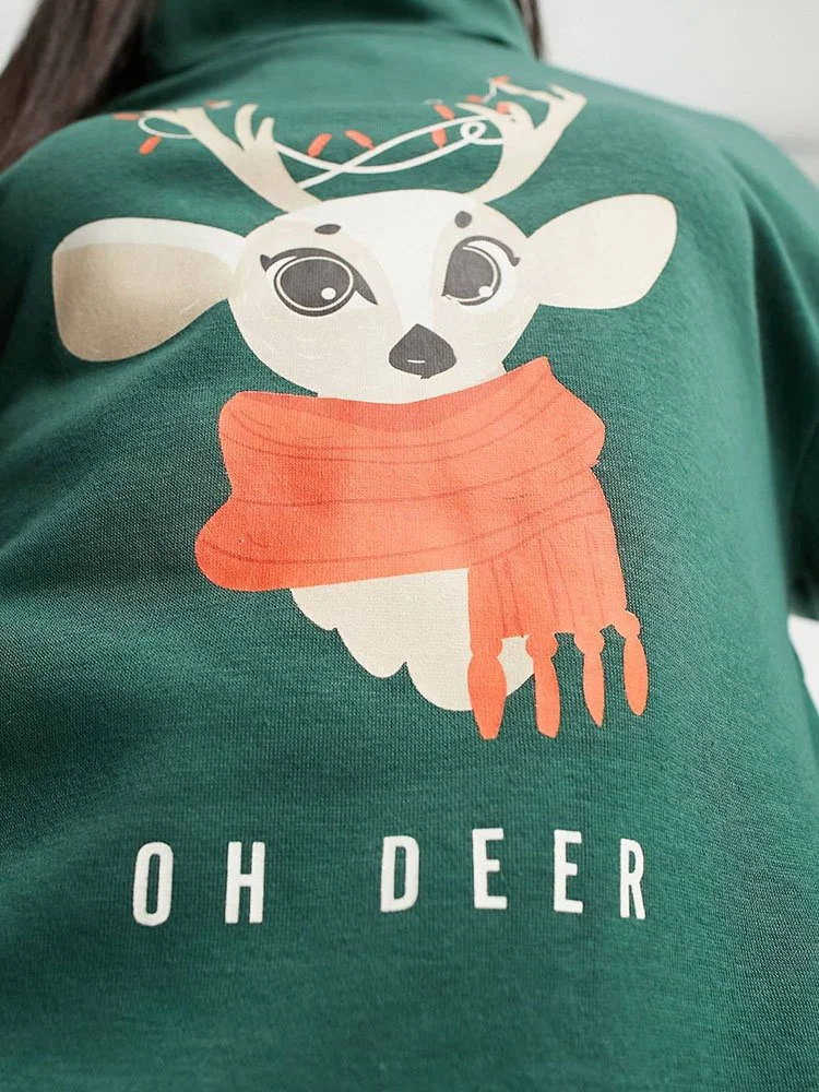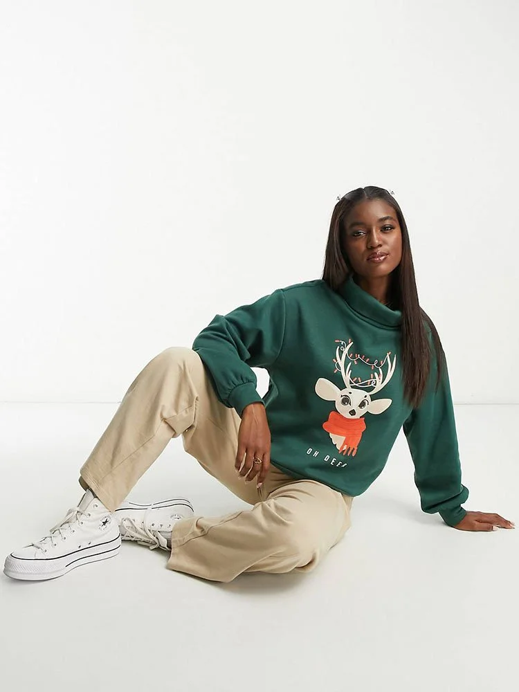 Suéter con cuello vuelto, manga larga y estampado navideño en el pecho.