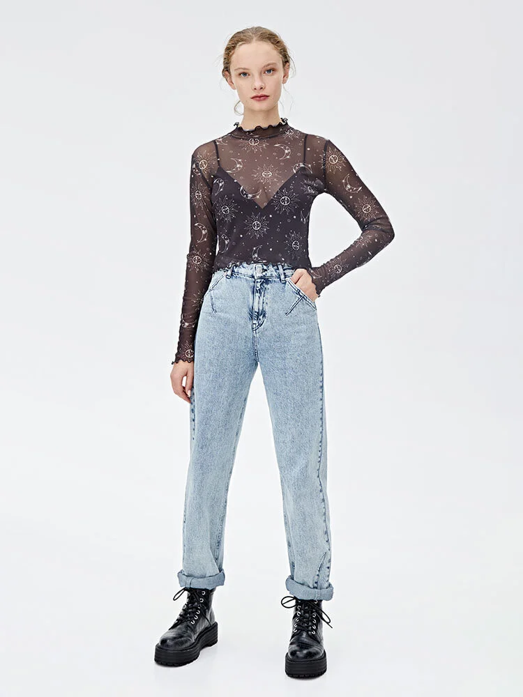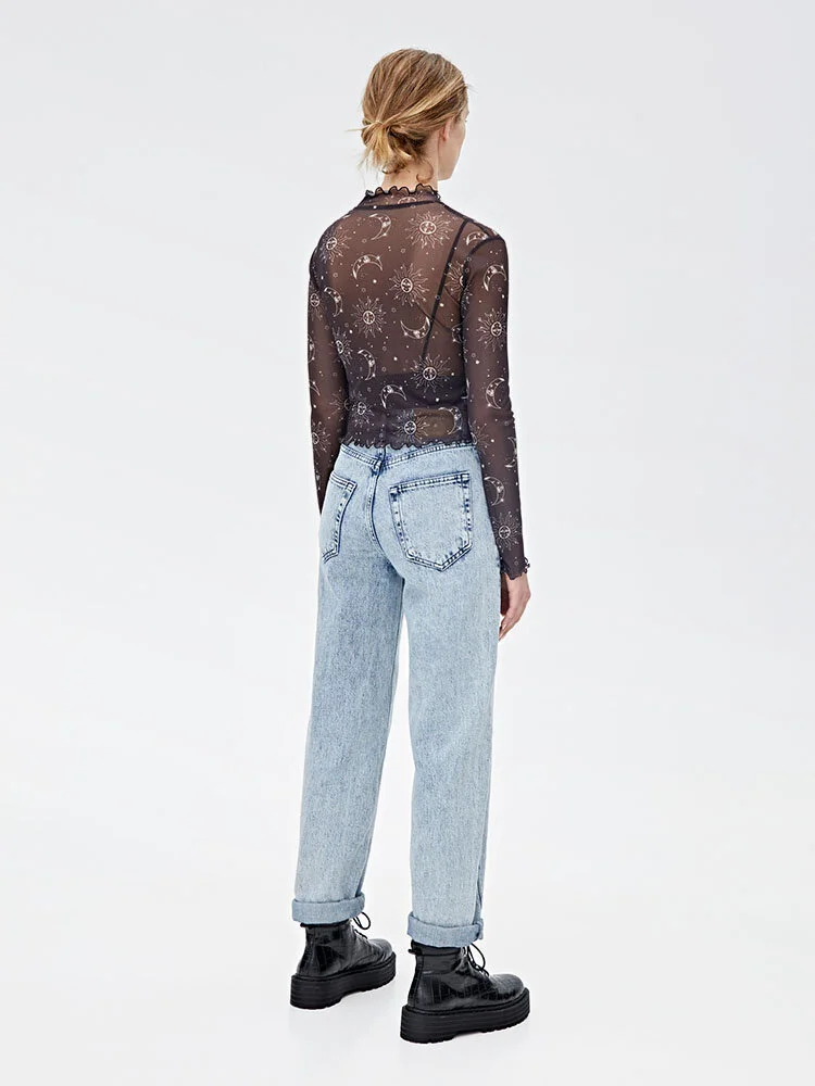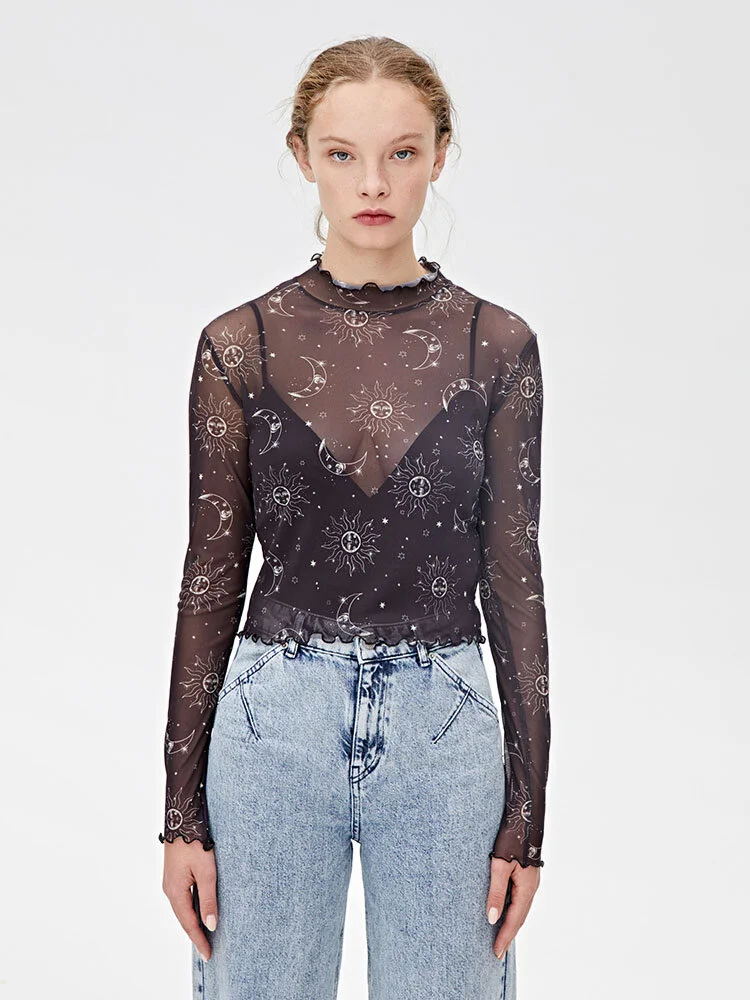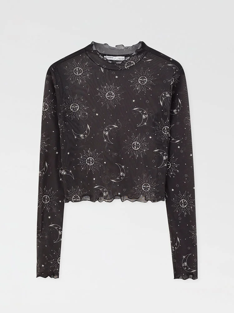 Camiseta de tul manga larga con dobladillo en puños, cintura y cuello. Confeccionada en tela ligeramente elástica y transparente.