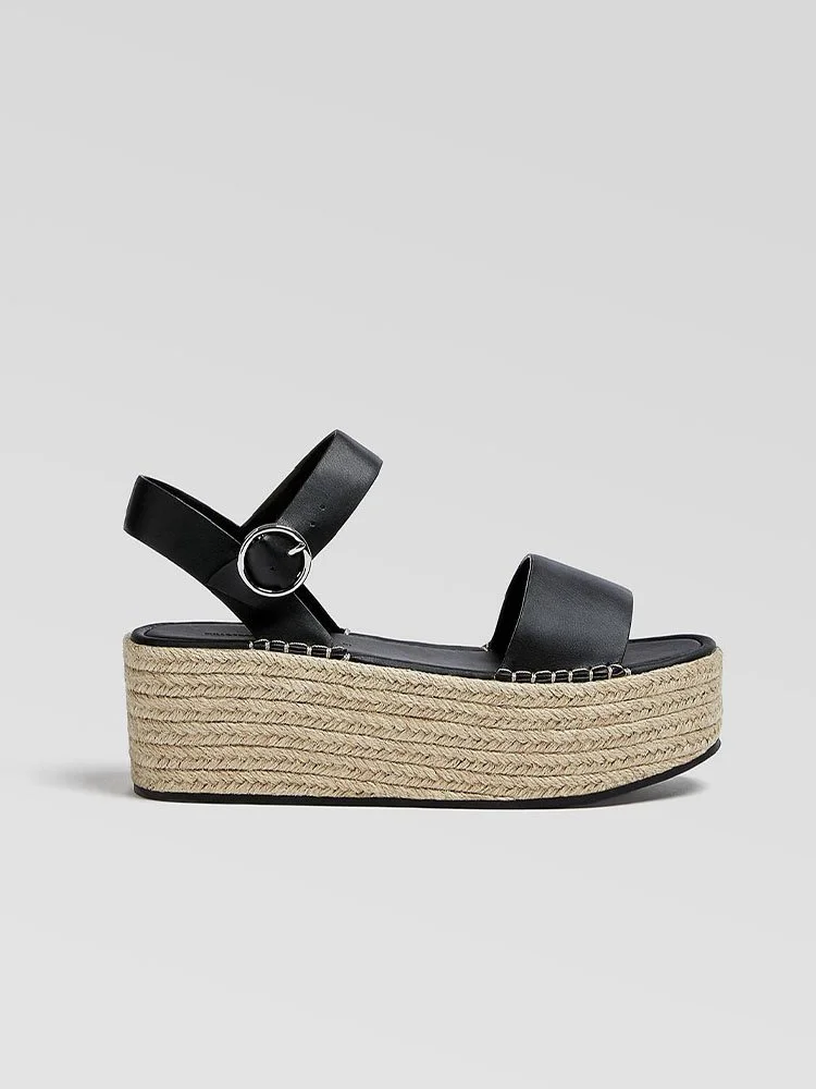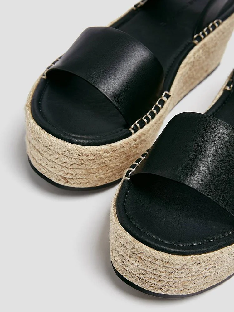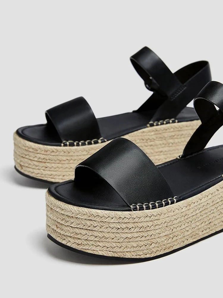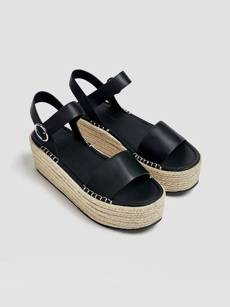 Espadrille con correa ajustable en el tobillo, cierre de hebilla, puntera abierta, entresuela de cuerda y suela de plataforma.