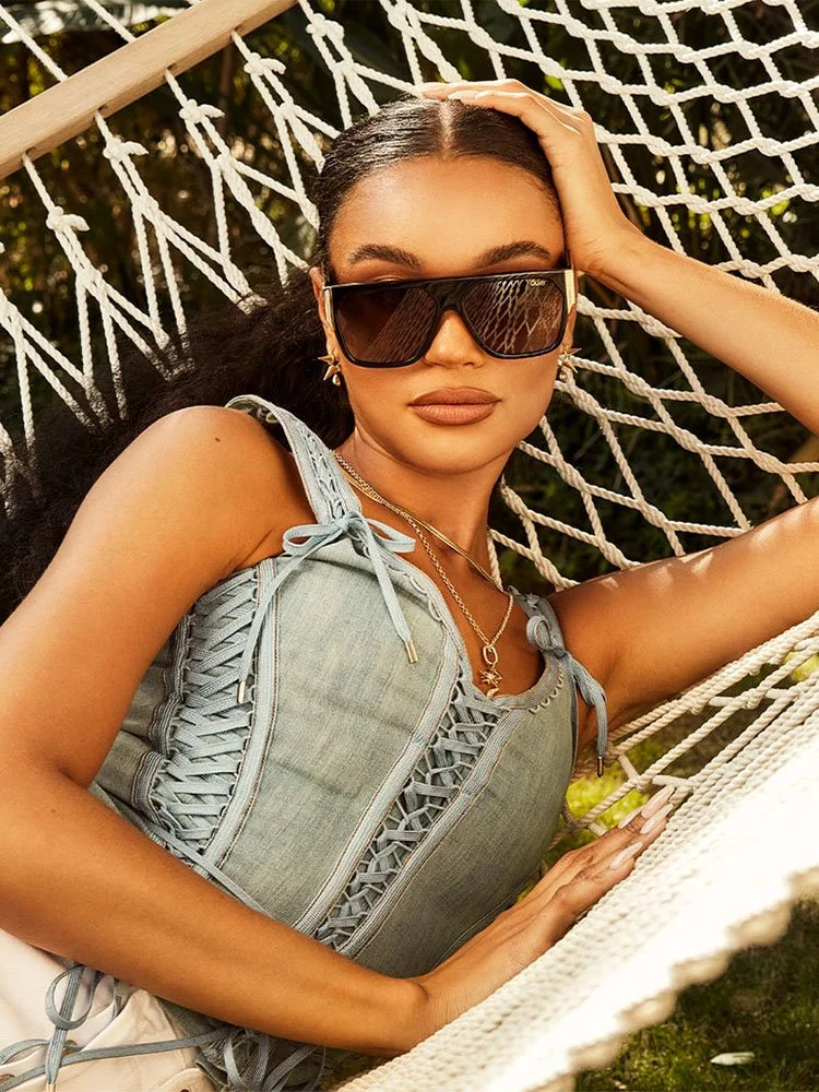 Estas modernas gafas cuenta con una parte superior plana, montura de acetato con detalles dorados como el logotipo de la lente, detalles recortados para reducir el deslumbramiento y mejorar la claridad en todos los momentos brillantes.