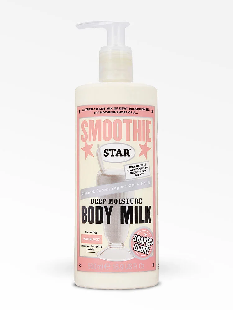 La leche corporal humectante Smoothie Star es una bomba cargada de manteca de cacao, manteca de karité, aceite de coco y WATERLOCK ™ de Soap & Glory, que suaviza la piel, también acondiciona gracias a su fórmula de avena, yogurt y miel. Con su delicioso aroma a almendra, avena y azúcar moreno, te enamorarás de este producto, tanto que al usarlo te volverás adicta a el. Soap & Glory está obligado a informarle que, a pesar del olor que provoca la sensación de hambre, Smoothie Star no es un alimento.