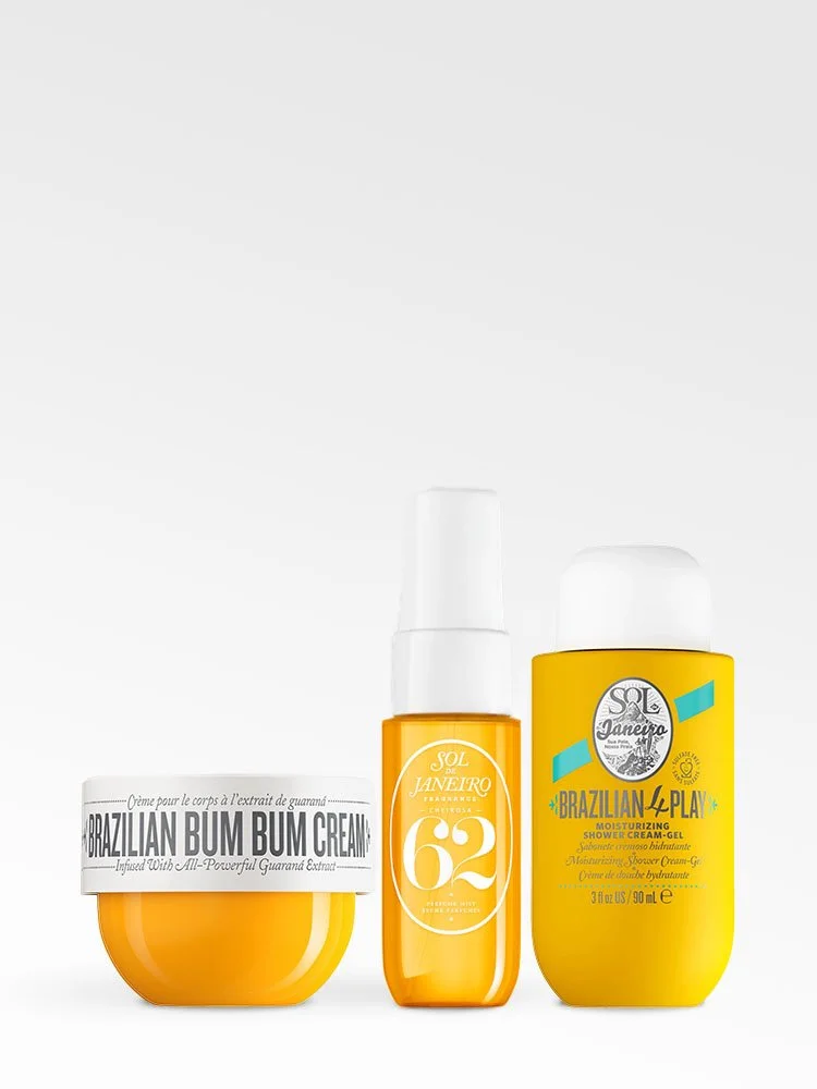 Brazilian Bum Bum Cream crema reafirmante y alisante para glúteos y caderas 50 ml (1.7 fl oz) | Brazilian 4Play gel de ducha en crema 90 ml (3.0 fl oz) |Brazilian Crush Cheirosa ’62 Bruma perfumada corporal y capilar para mujer 30 ml (1.0 fl oz)