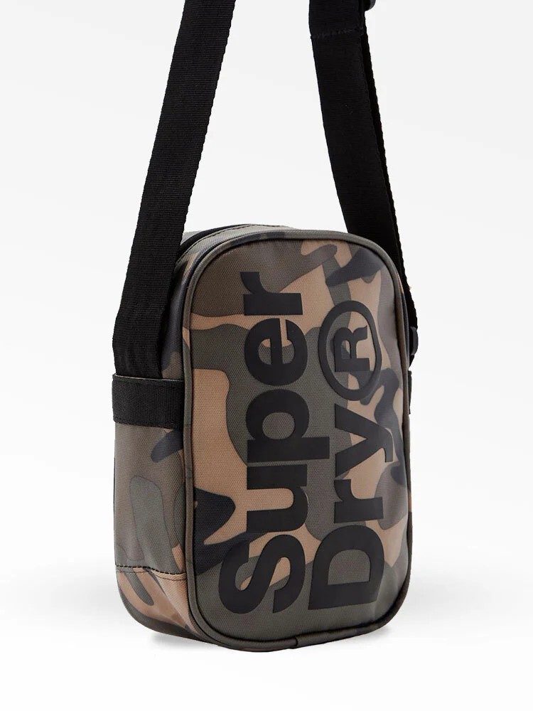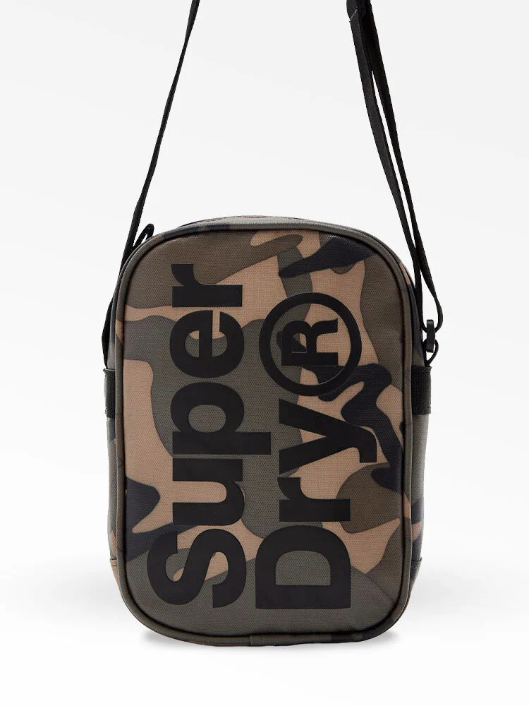 Parte superior de PU lisa con estampados de camuflaje. Compartimento principal con bolsillo interior de malla. Correa ajustable. Estampado con el logo de Superdry.