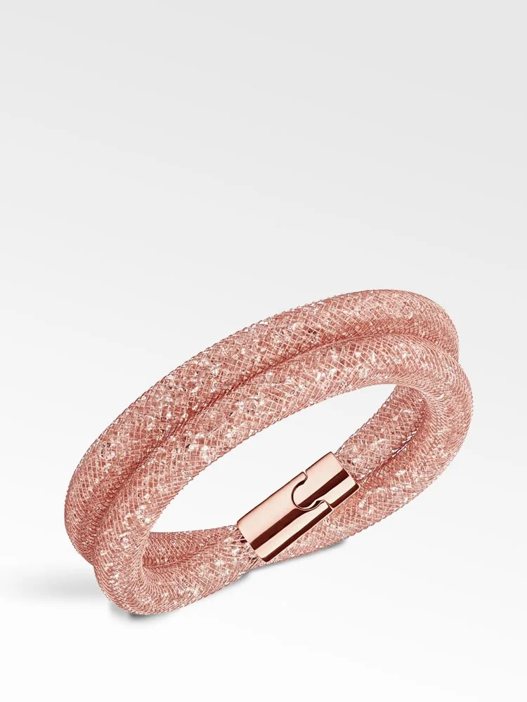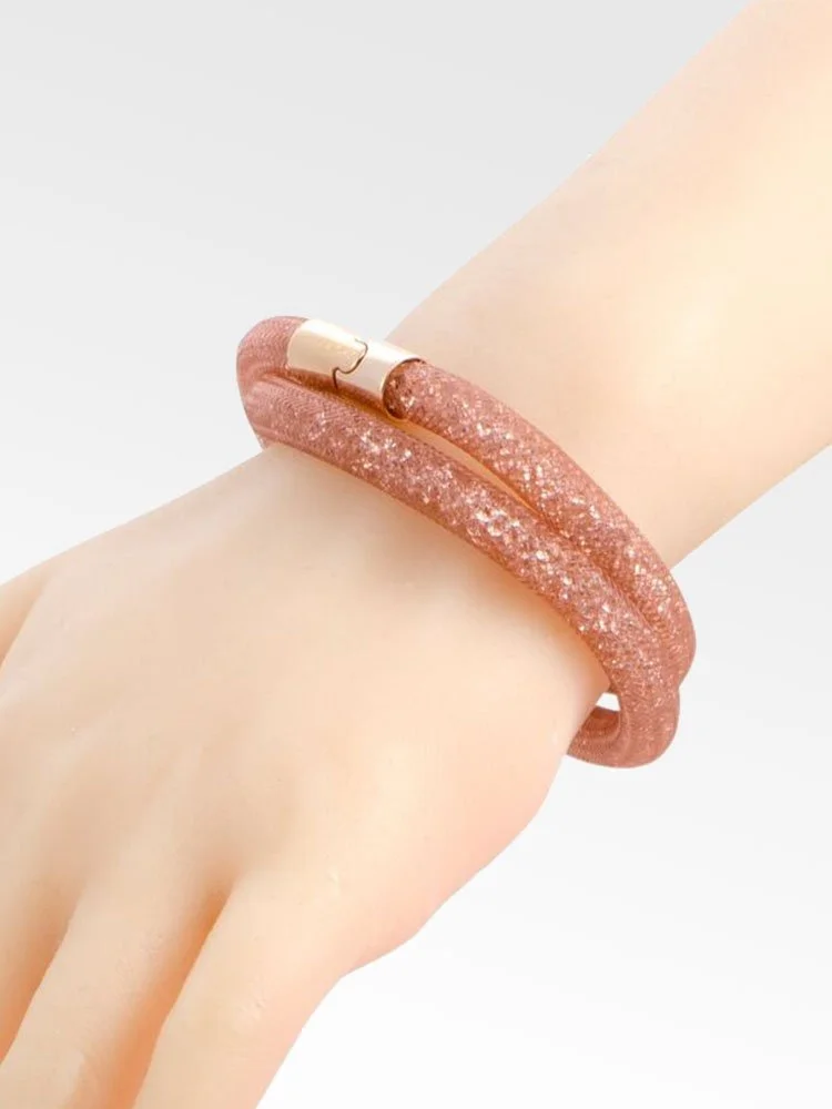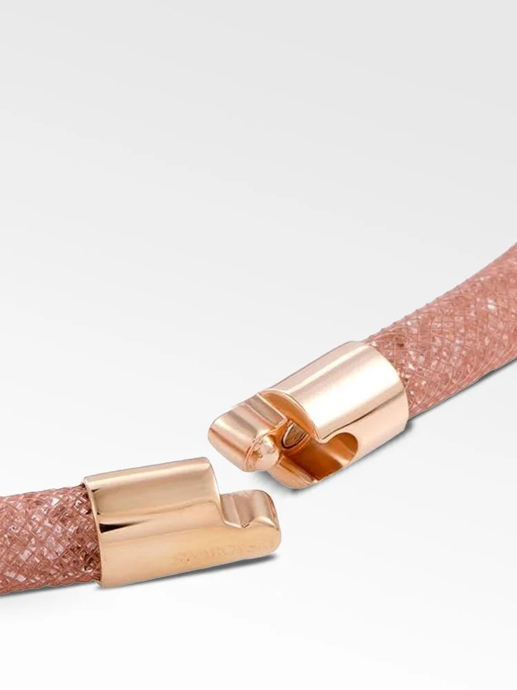 Esta vibrante pulsera se puede usar como pulsera de doble vuelta o gargantilla. Cuenta con un tubo de red de nailon rosada lleno de pequeños cristales rosados que crean una silueta tridimensional. Su cierre magnético es fácil de usar y está hecho de metal bañado en oro rosa.