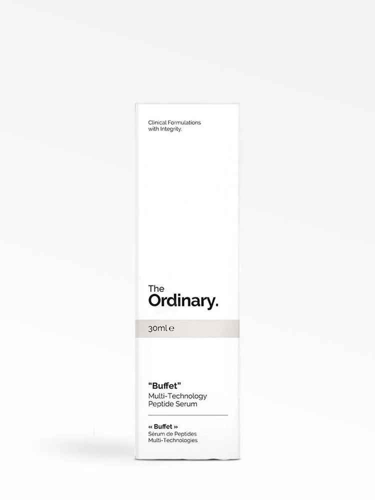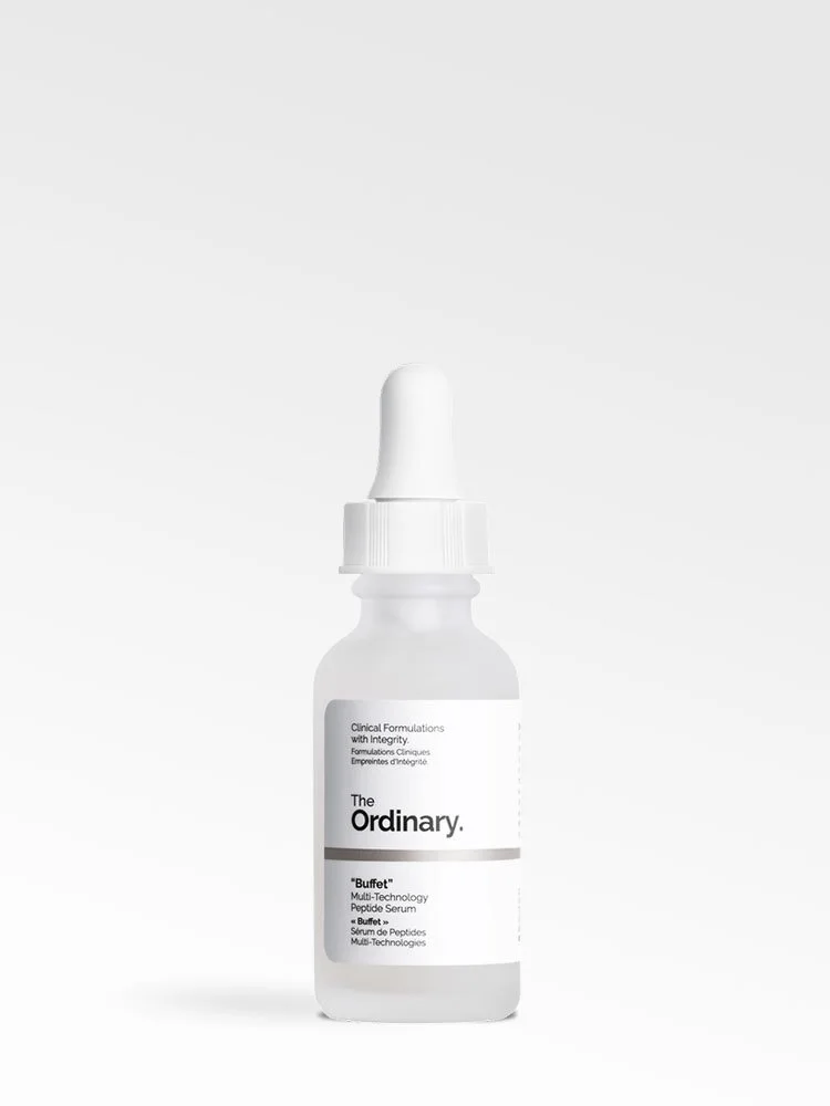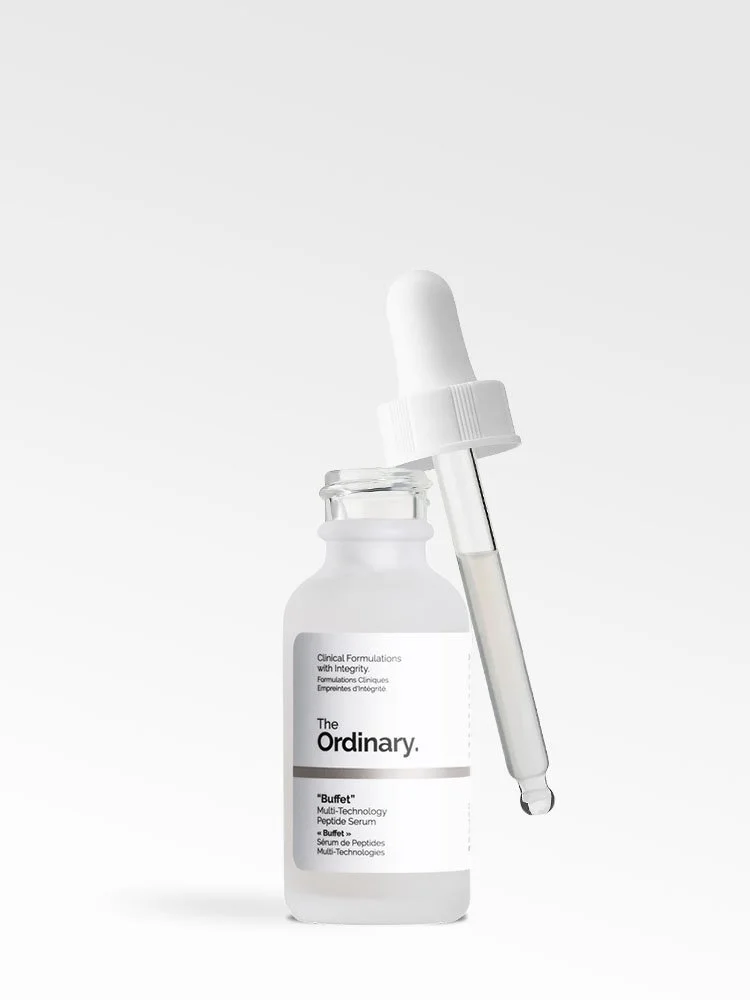 «Buffet» es un sérum a base de agua con una variedad de tecnologías antiedad, que incluyen péptidos, pro bióticos, aminoácidos y más.