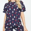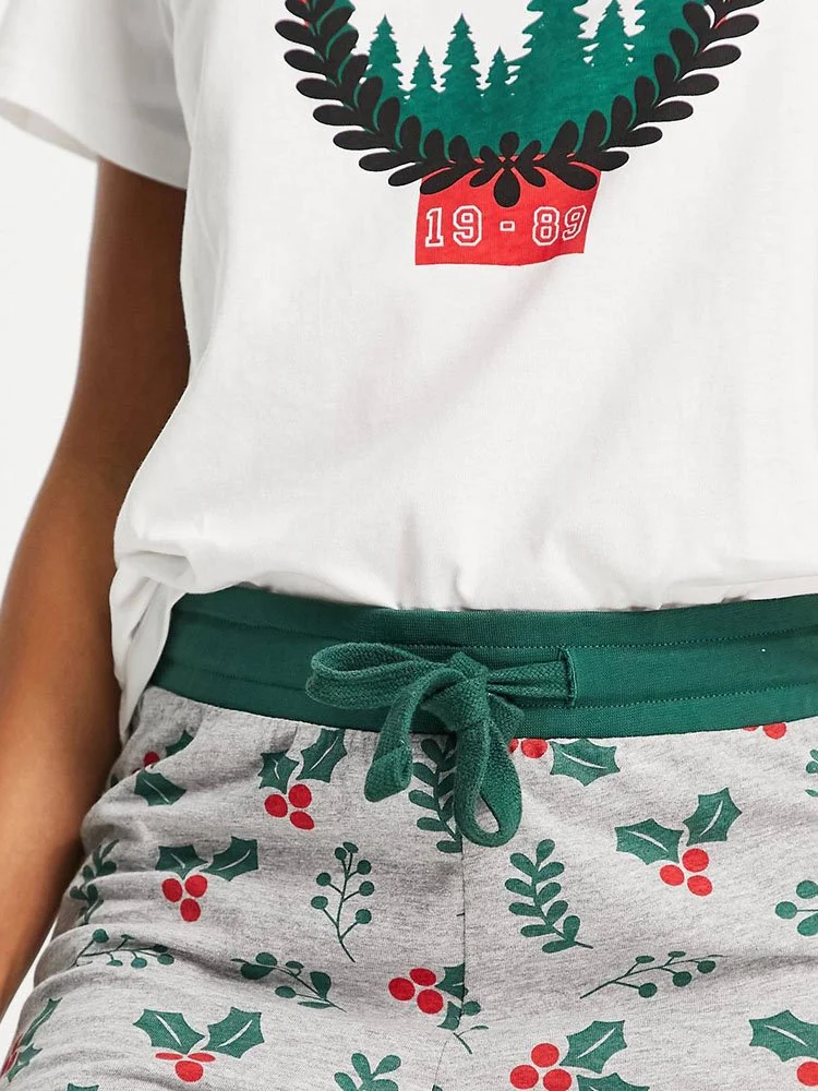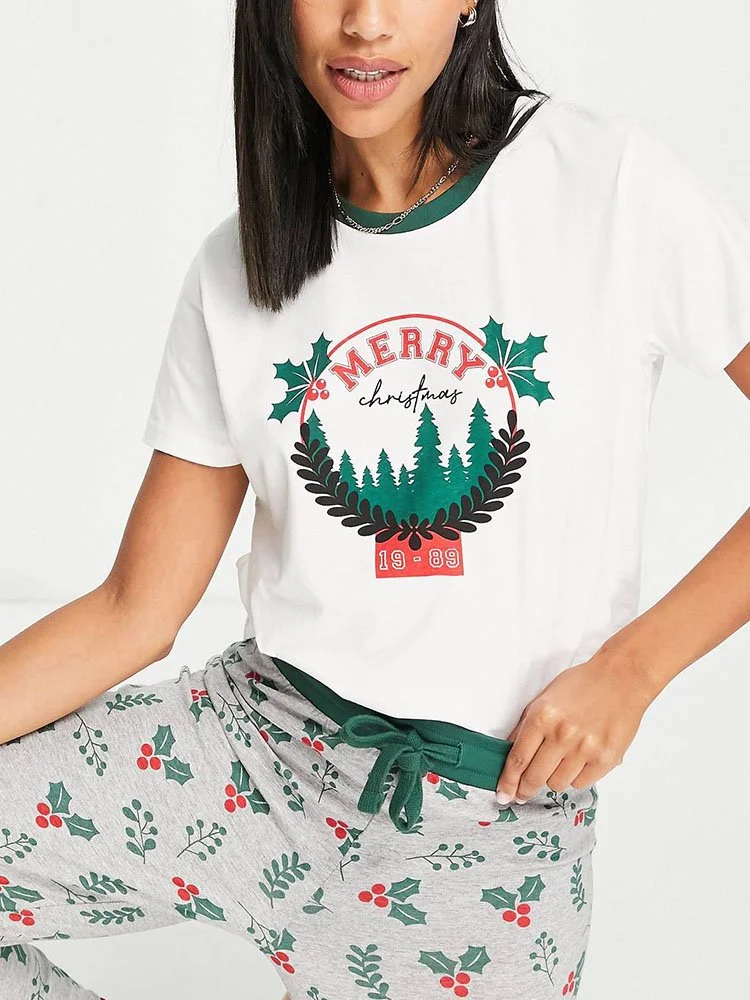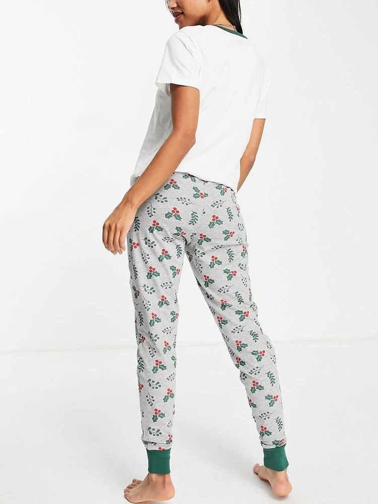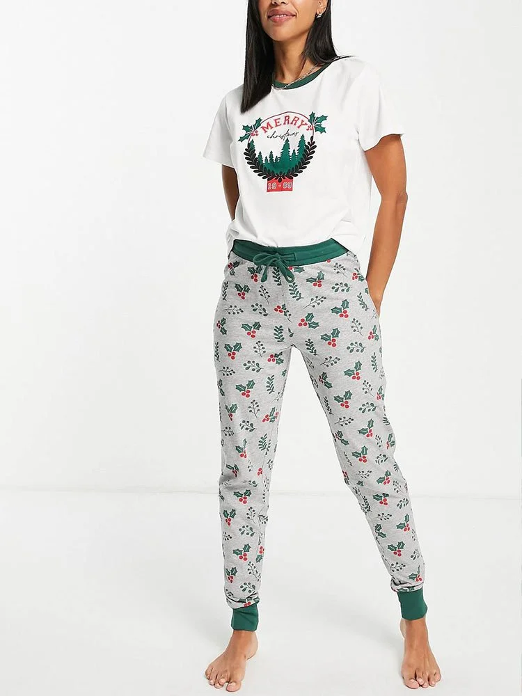 Conjunto de pijama con top regular con estampado navideño en el delantero, cuello redondo y manga corta. Pantalones deportivos regulares y cónicos con cintura elástica y puños ajustados.