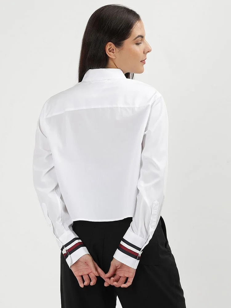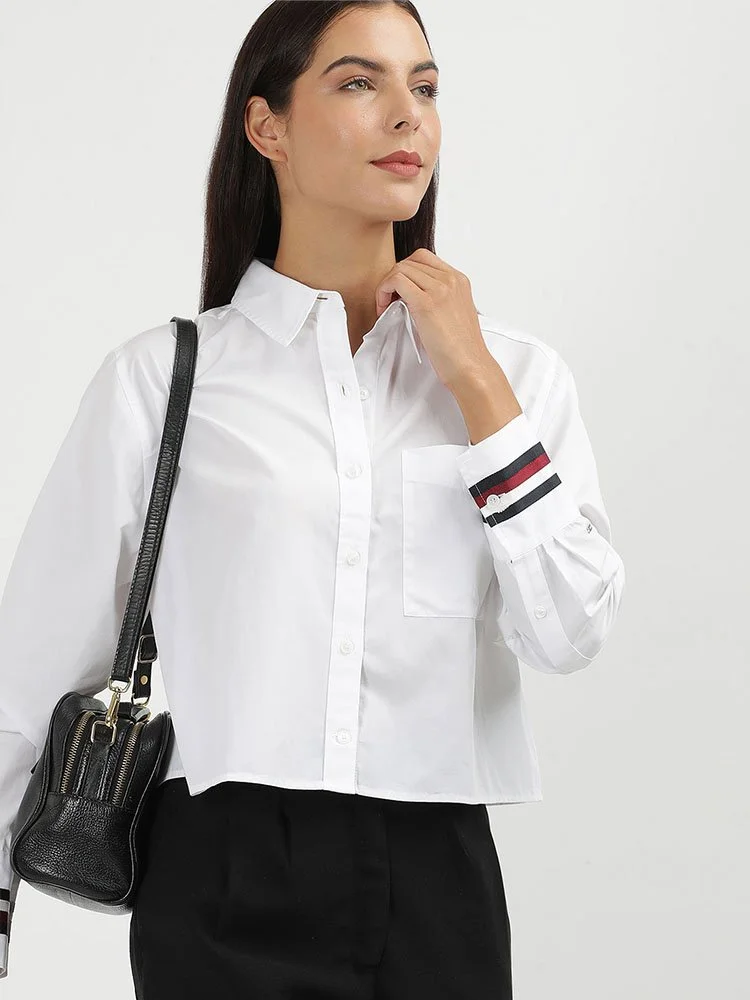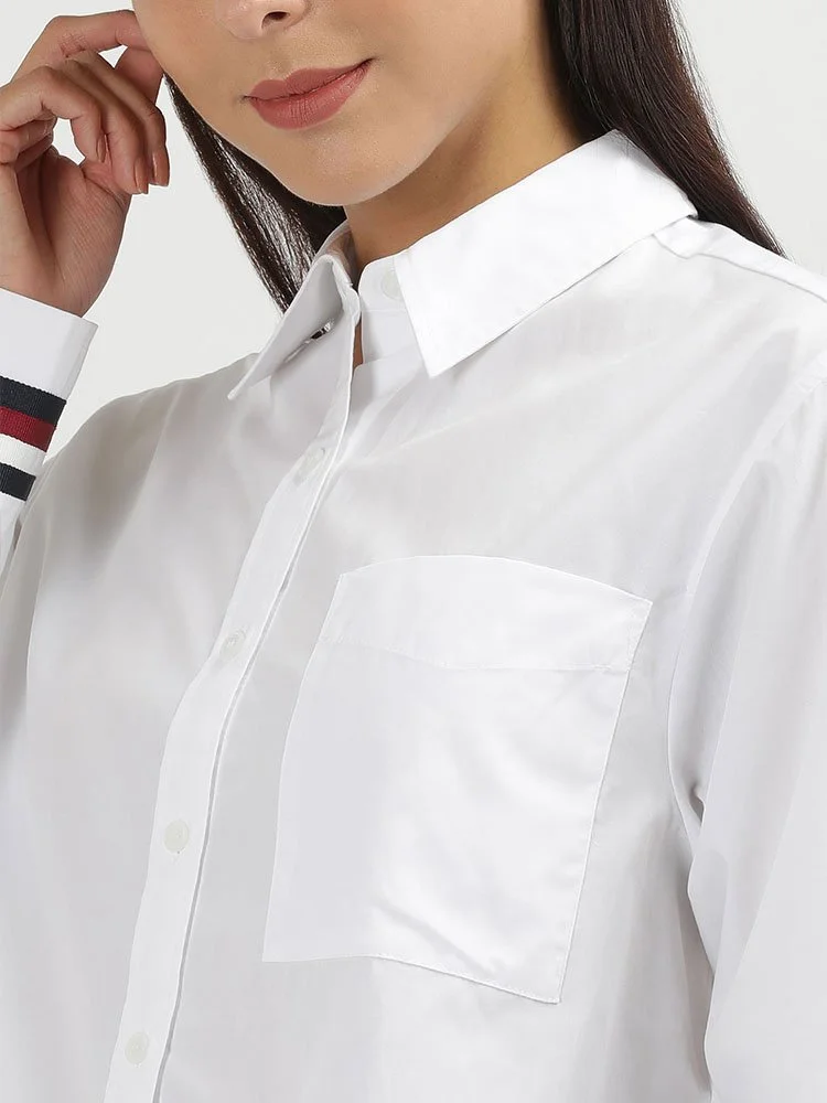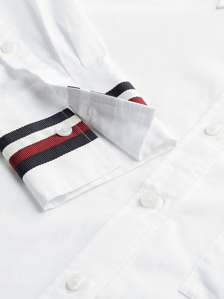 Camisa informal blanca opaca y lisa, con cuello extendido, frontal con botones, bolsillo, mangas largas y regulares y dobladillo recto a rayas con los colores de la marca.