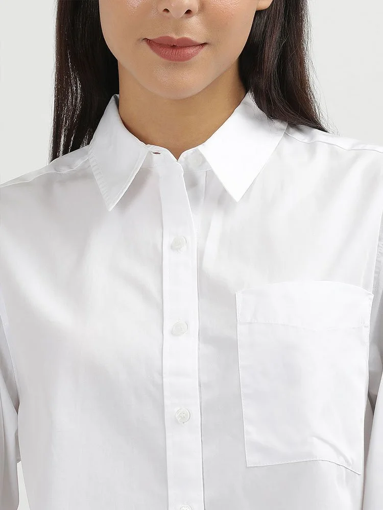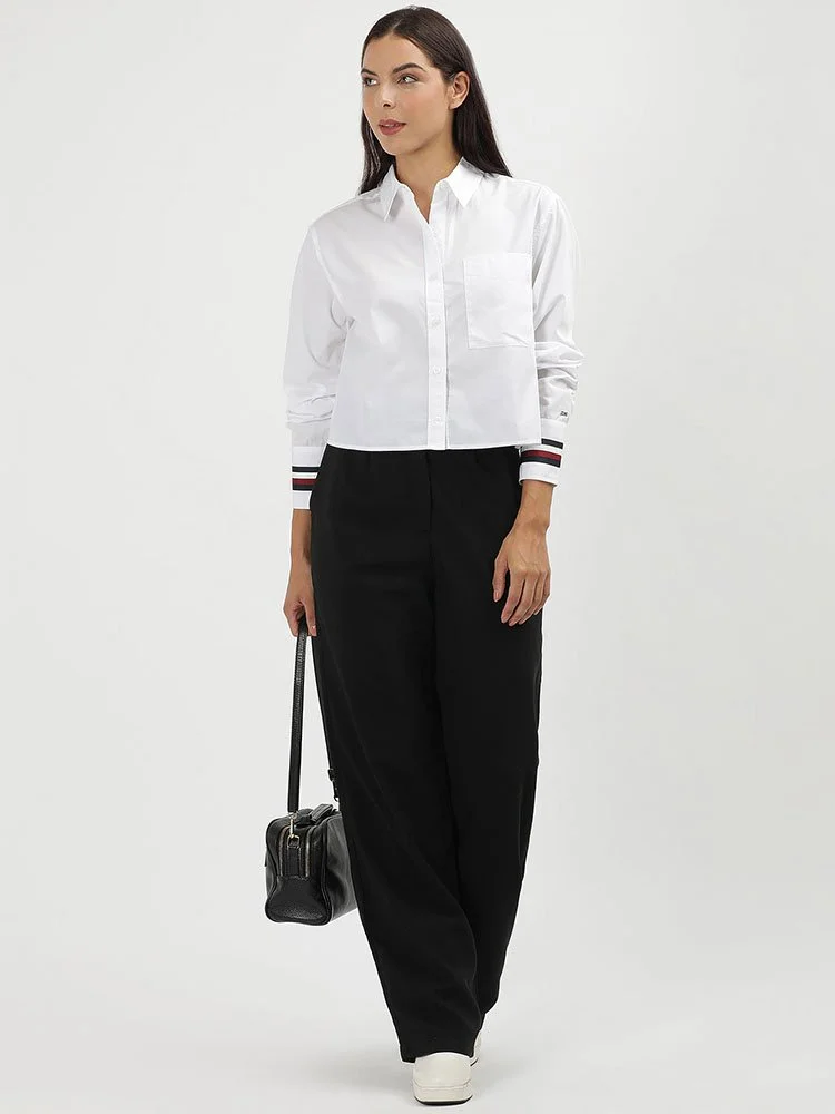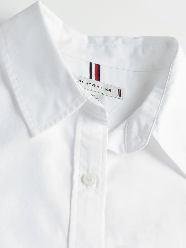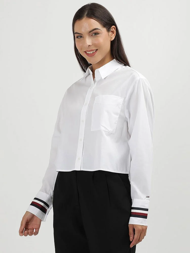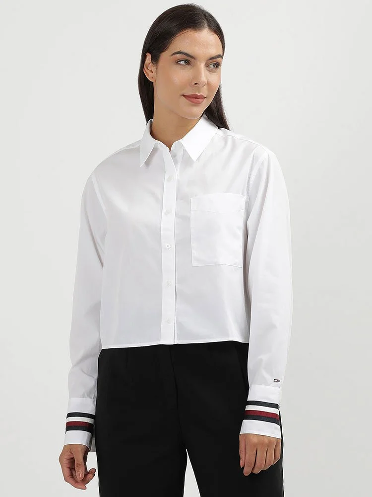 Camisa informal blanca opaca y lisa, con cuello extendido, frontal con botones, bolsillo, mangas largas y regulares y dobladillo recto a rayas con los colores de la marca.