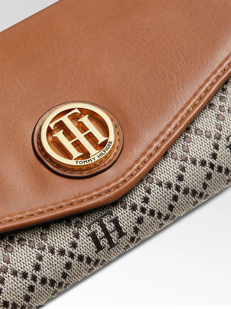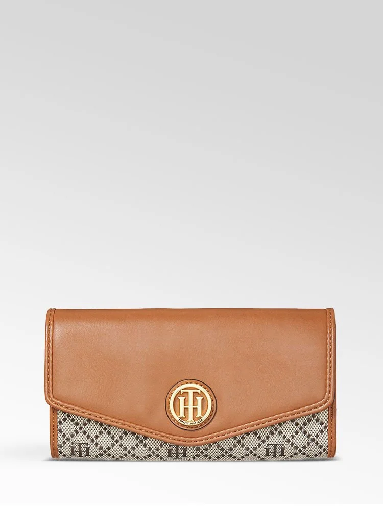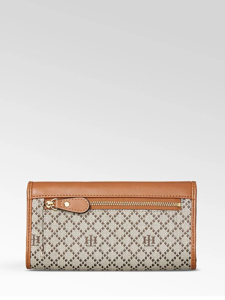 Esto monedero se abre para revelar un amplio espacio para sus tarjetas y dinero, y se vuelve memorable con nuestro monograma dorado y patrón de tejido distintivo.