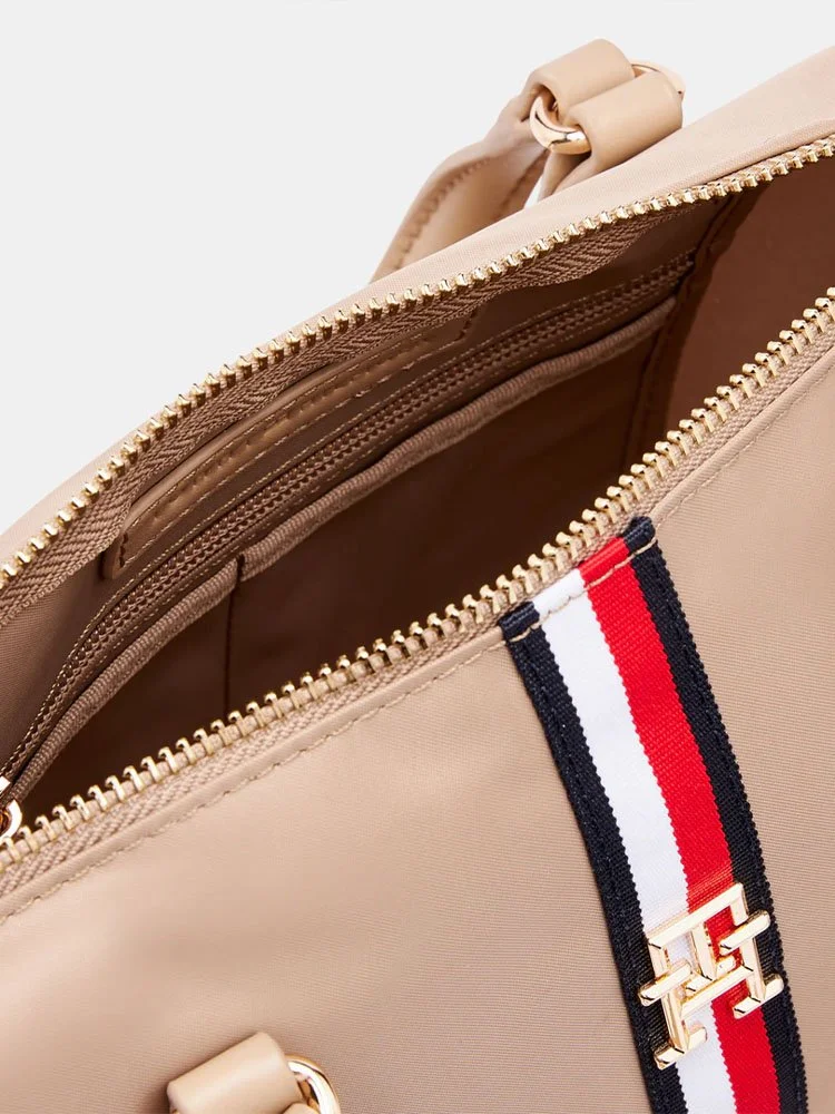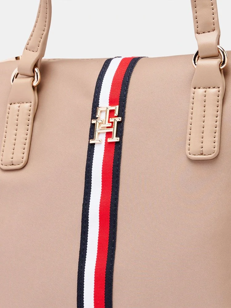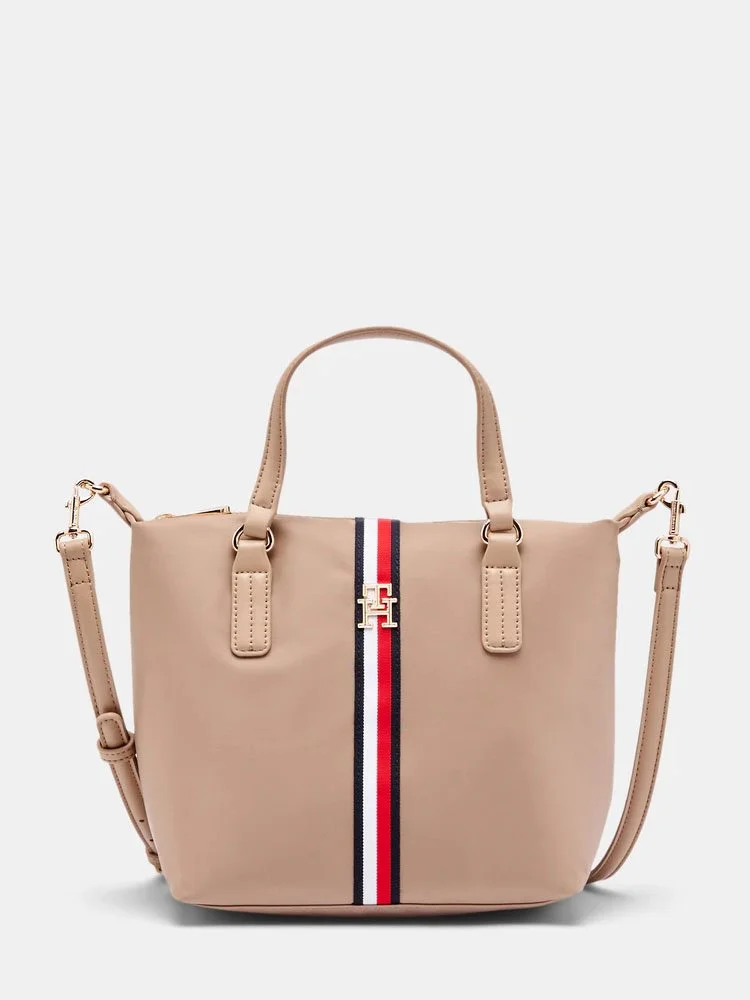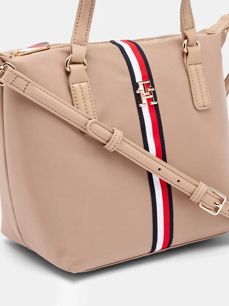 Desde el trabajo hasta los fines de semana, complementa tu estilo sofisticado con un pequeño detalle de Tommy Hilfiger. Presentamos el bolso tote pequeño Poppy, que cuenta con una correa ajustable para el hombro y un interior espacioso para una practicidad y organización sin esfuerzo. Adornado con herrajes en tono dorado y un acabado de nailon suave, esta es una pieza que tendrás en constante rotación.