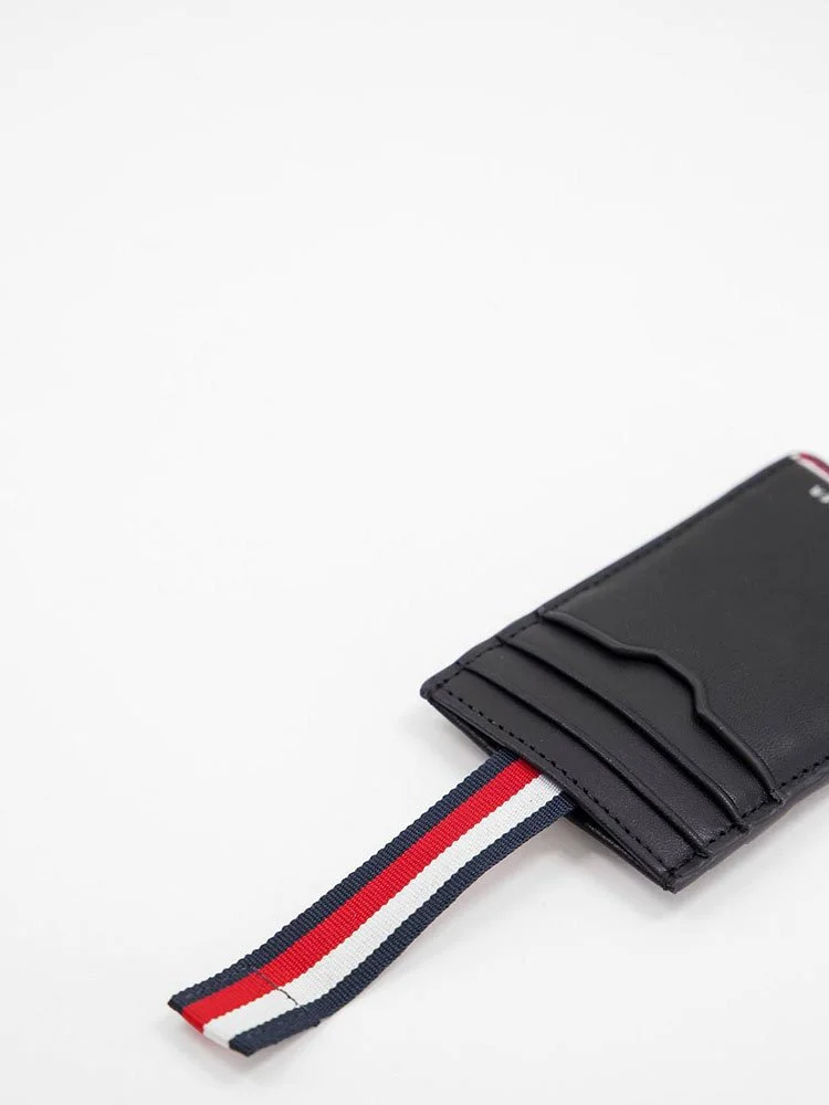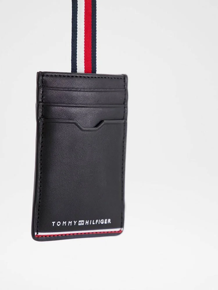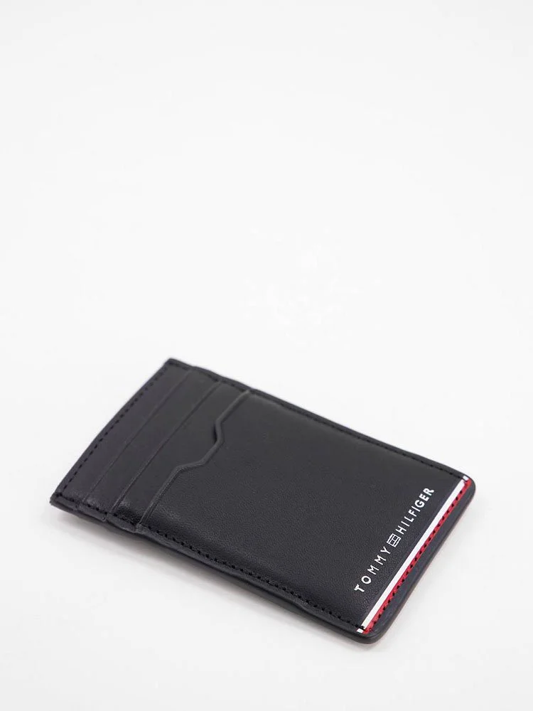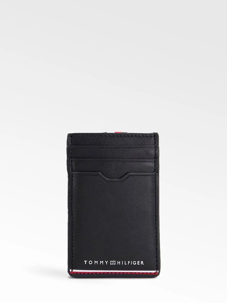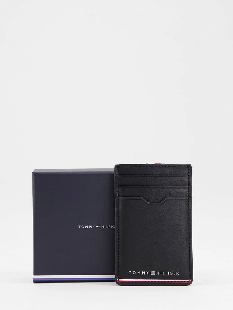 Porta arjeta de piel con acabado liso que facilita el acceso a billetes, carnet de identificación y tarjetas con su etiqueta de cinta distintiva en la parte superior y el logotipo de Tommy Hilfiger en la parte delantera.