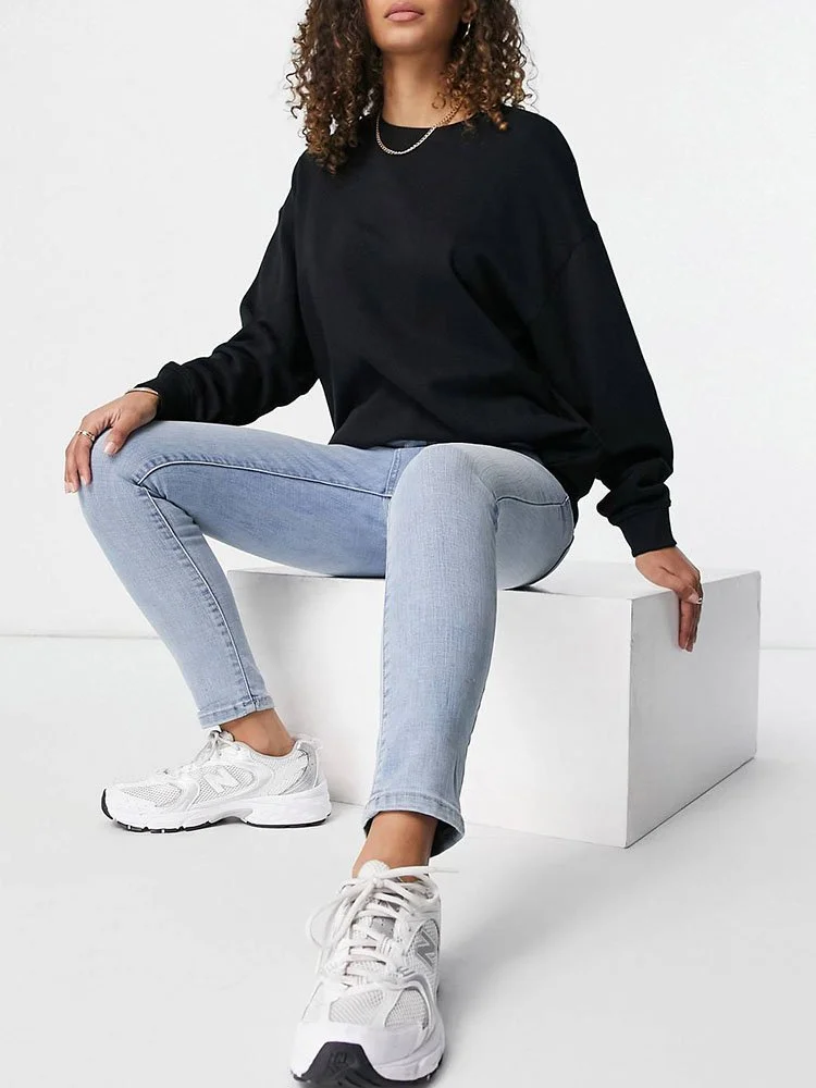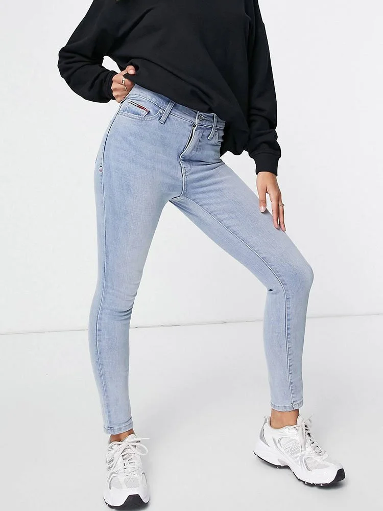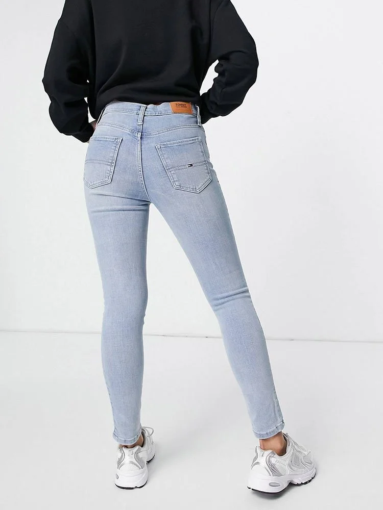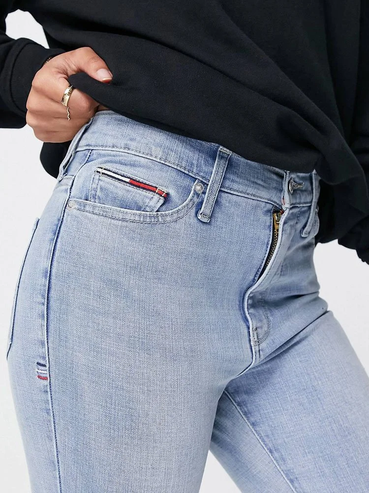 Jeans ajustados de tiro alto con trabillas para el cinturón, bragueta con cierre, cinco bolsillos y parche de la marca en la parte posterior.