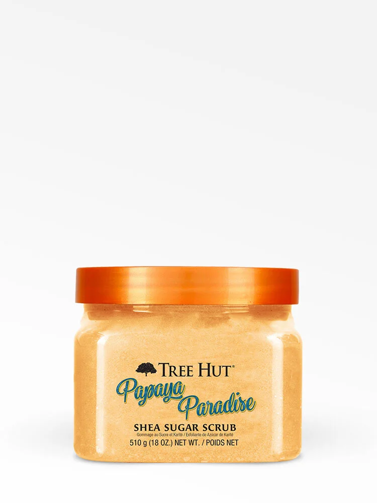 El exfoliante de azúcar de karité Papaya Paradise de Tree Hut es un exfoliante corporal que elimina la piel opaca y seca para revelar una piel brillante, suave y lisa. Nutre y equilibra profundamente la hidratación de la piel para ayudar a restaurar el brillo natural de la piel. Escápate a un paraíso lleno de una ráfaga de esencias jugosas de papaya, coco dulce, melocotón y melón.