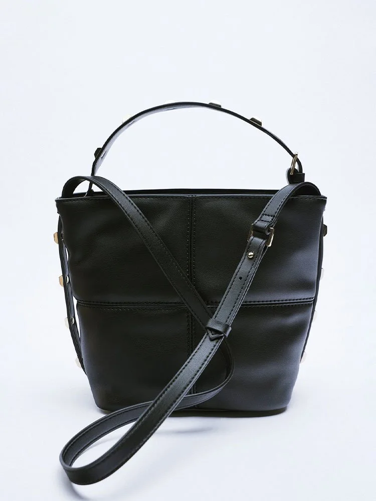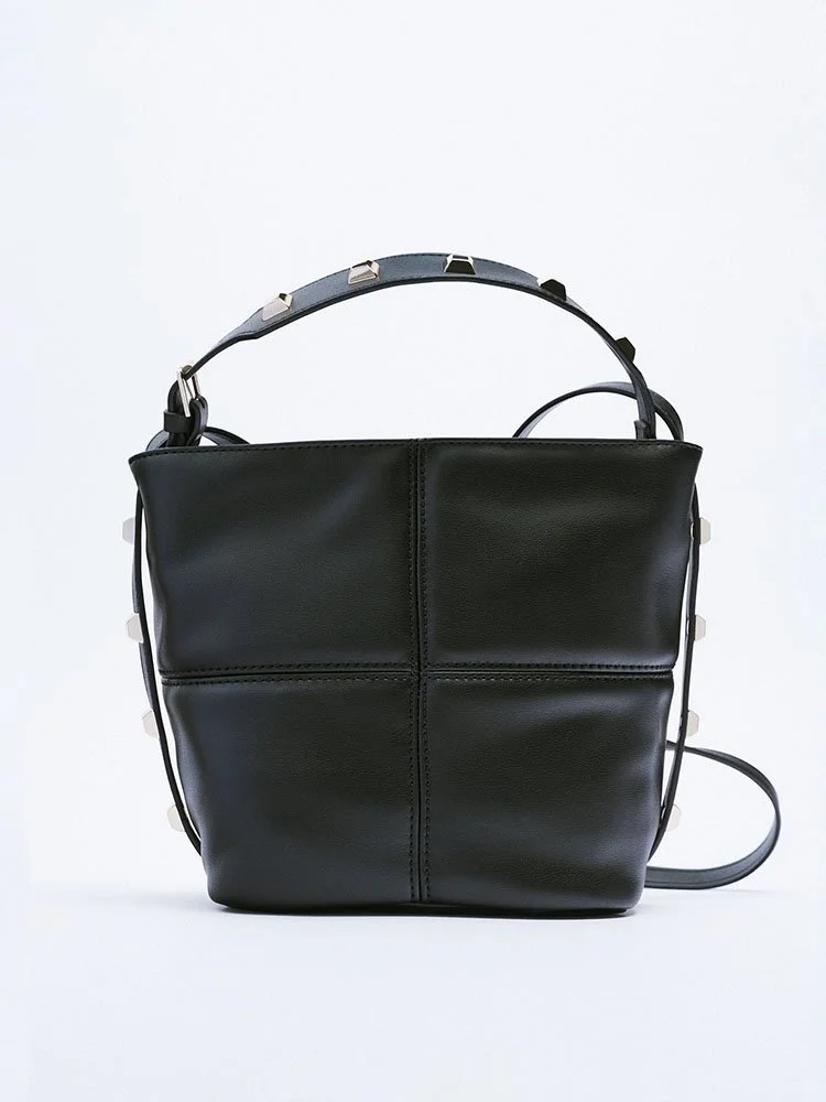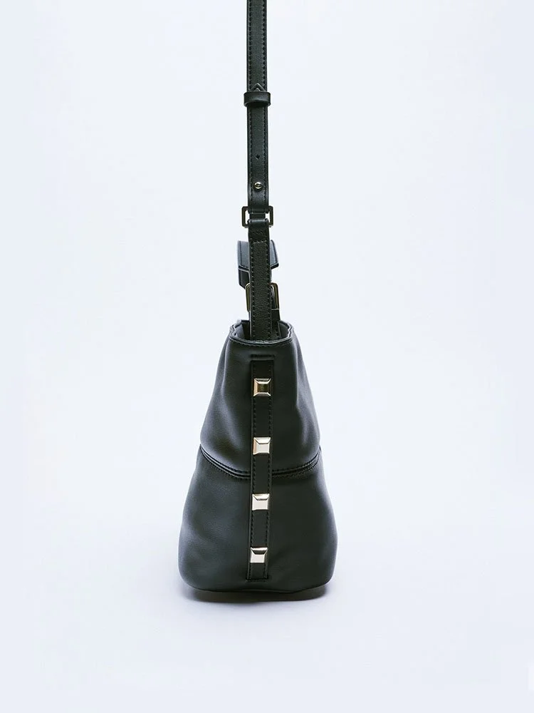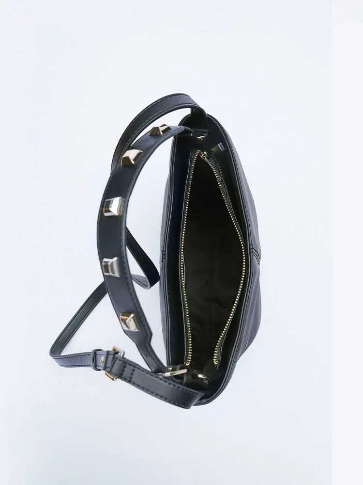 Bolso femenino con detalle de tachas en los laterales. Interior forrado con bolsillo. Asa de mano y asa función bandolera ajustable. Cierre mediante cremallera.