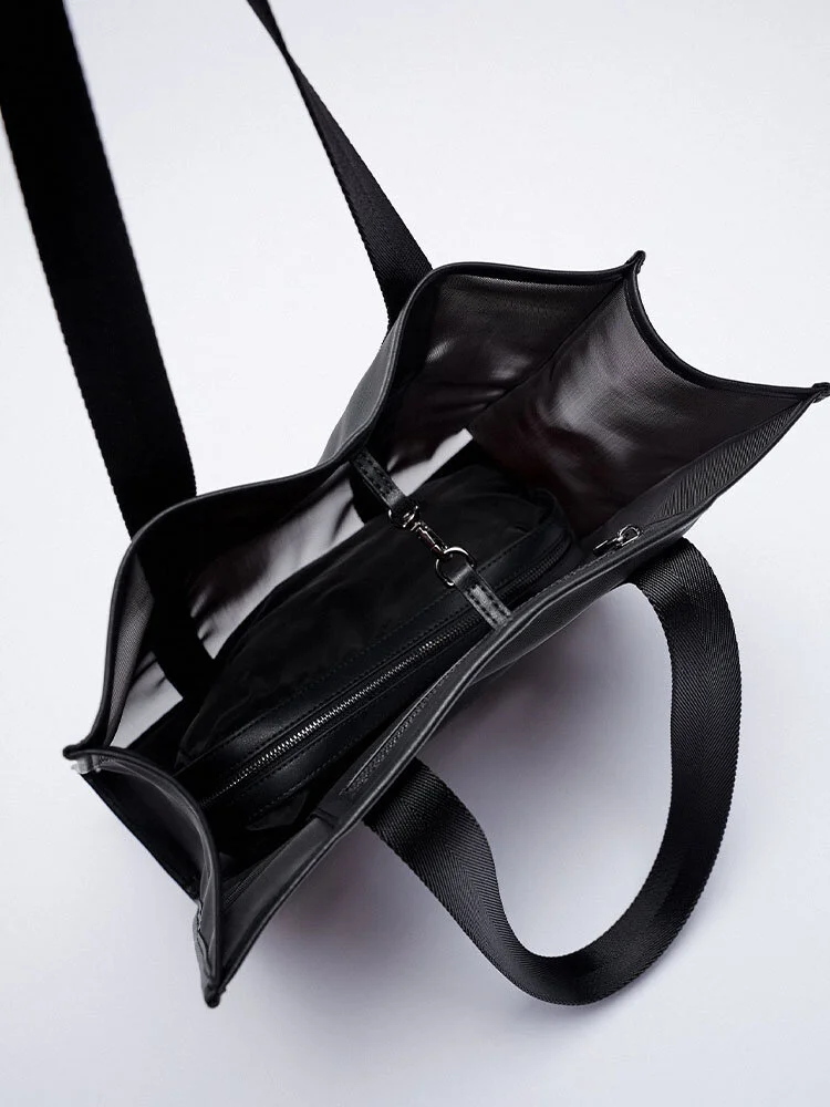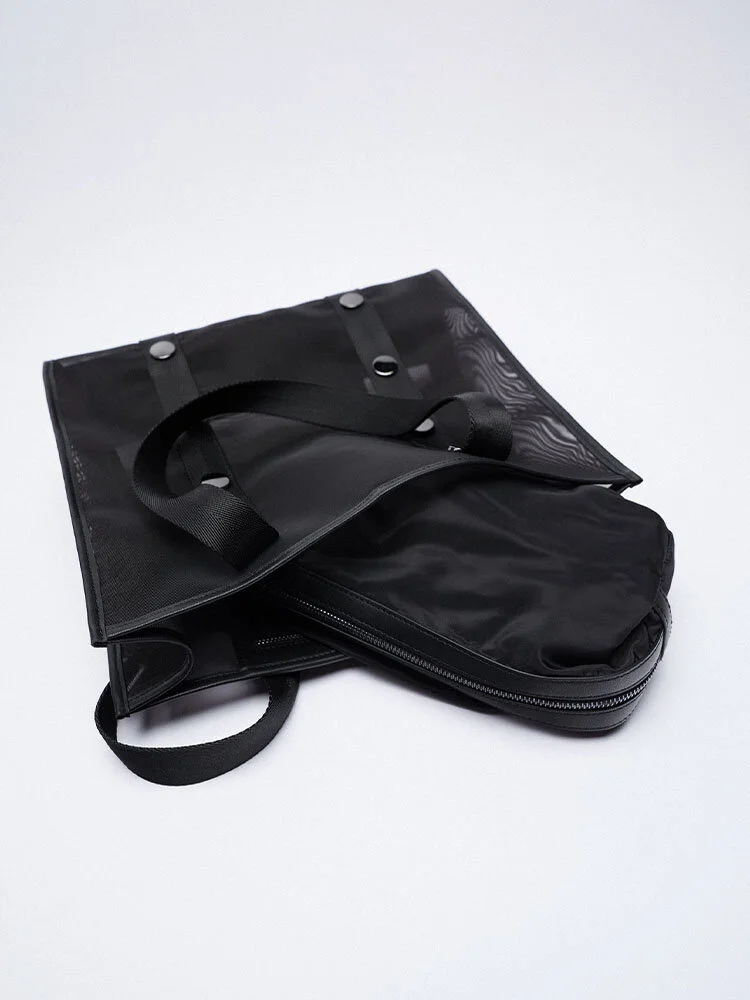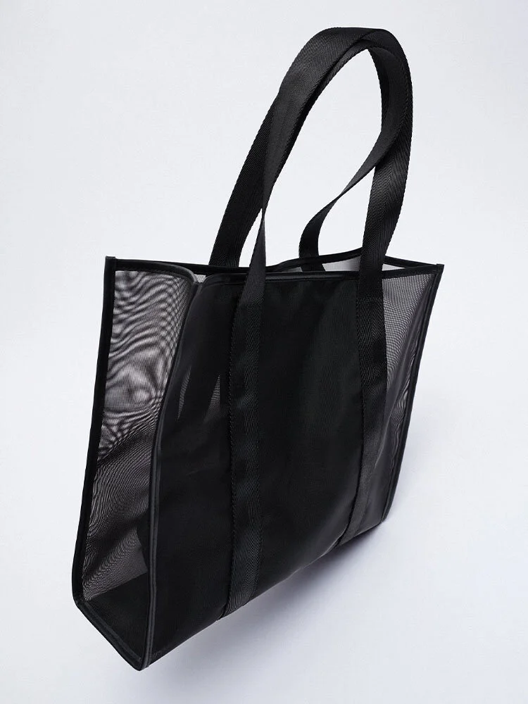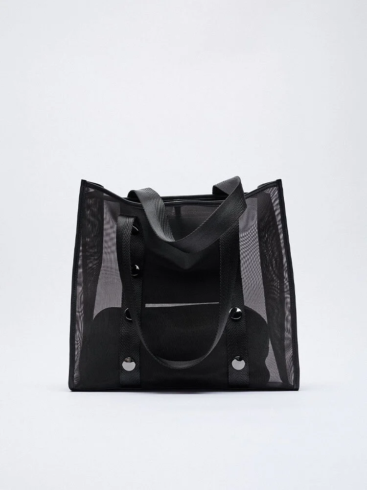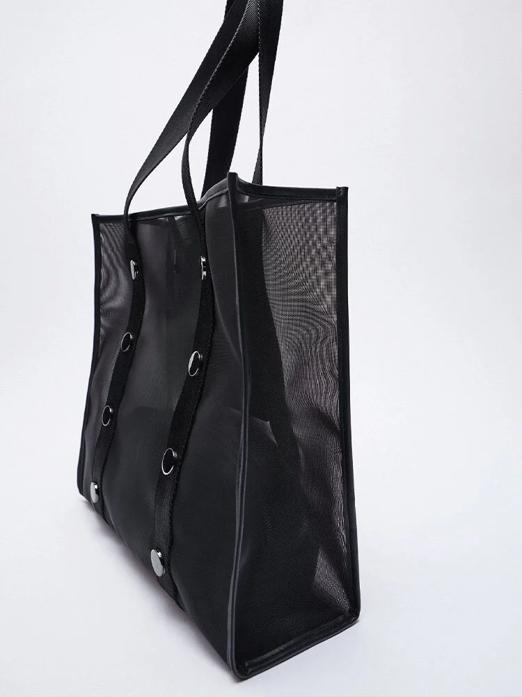 Bolso formato shopper con cuerpo de rejilla con detalles metálicos en la parte delantera. Bolsillo interior con cierre mediante cremallera. Incluye un neceser en el interior. Asas de hombro y cierre mediante enganche metálico.