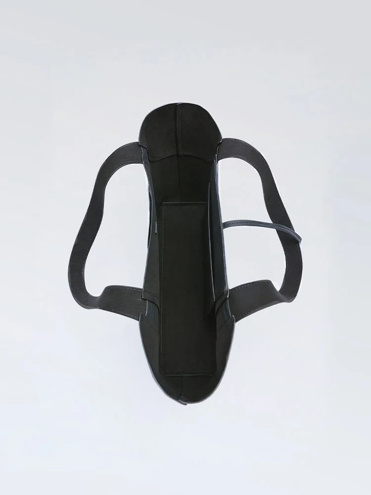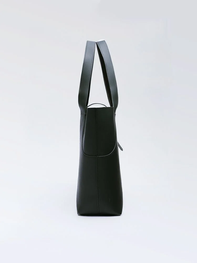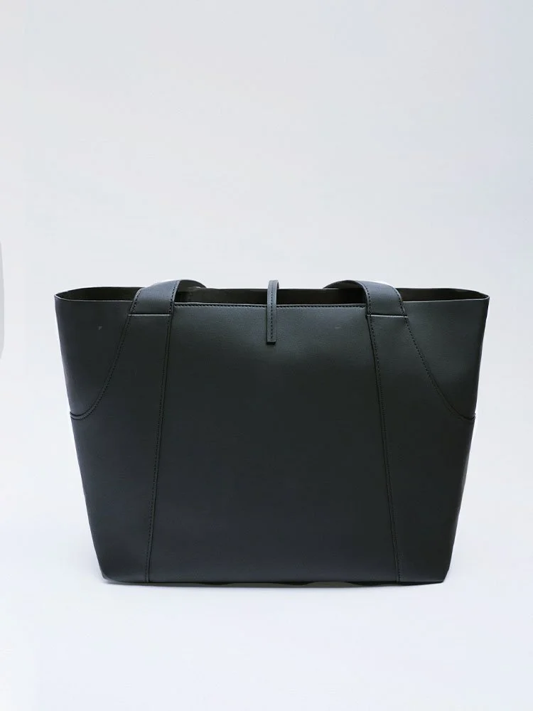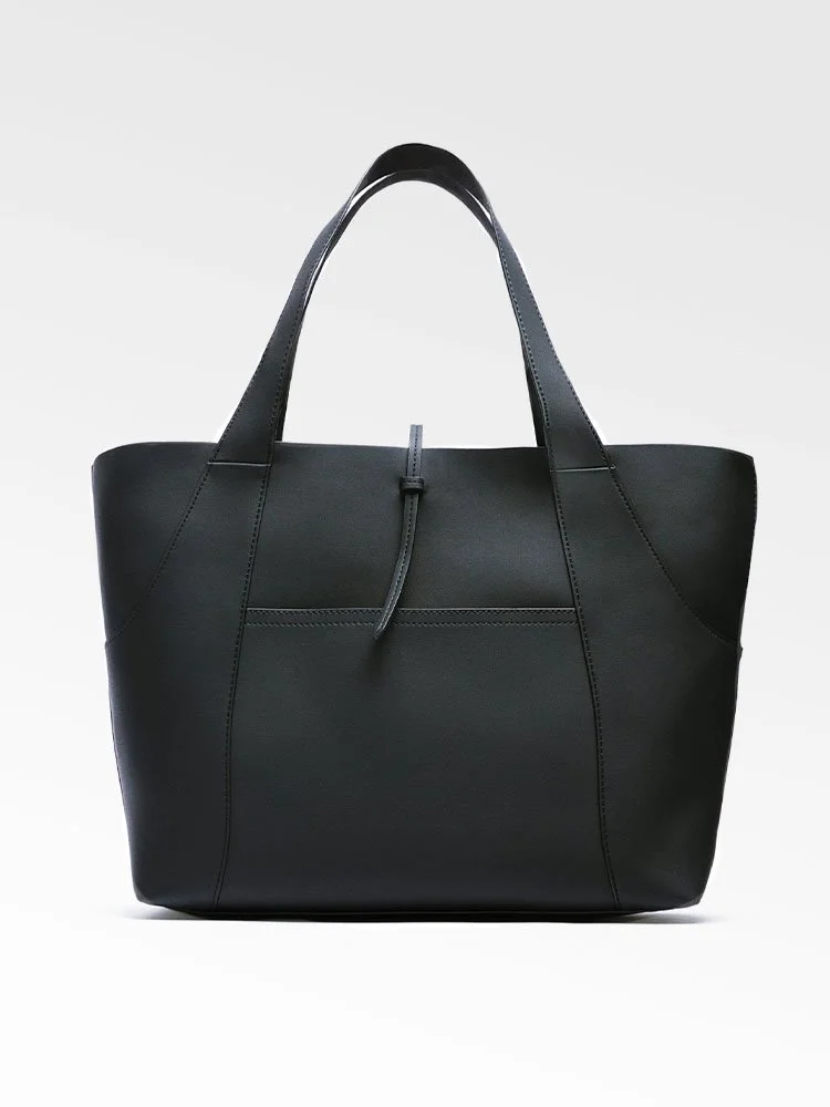 Bolso formato shopper con bolsillo exterior delantero y detalle de pespunte en el cuerpo. Interior con bolsillo. Asas de hombro. Cierre mediante tira con trabilla.