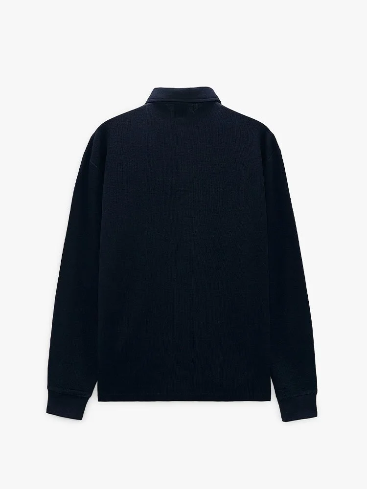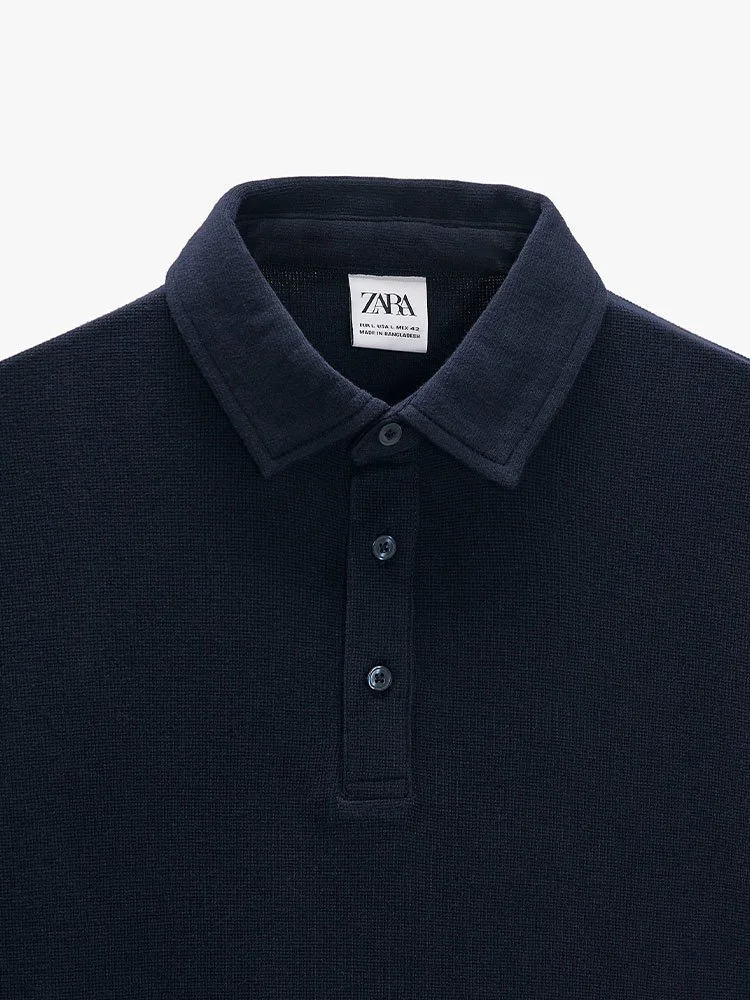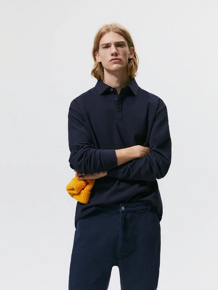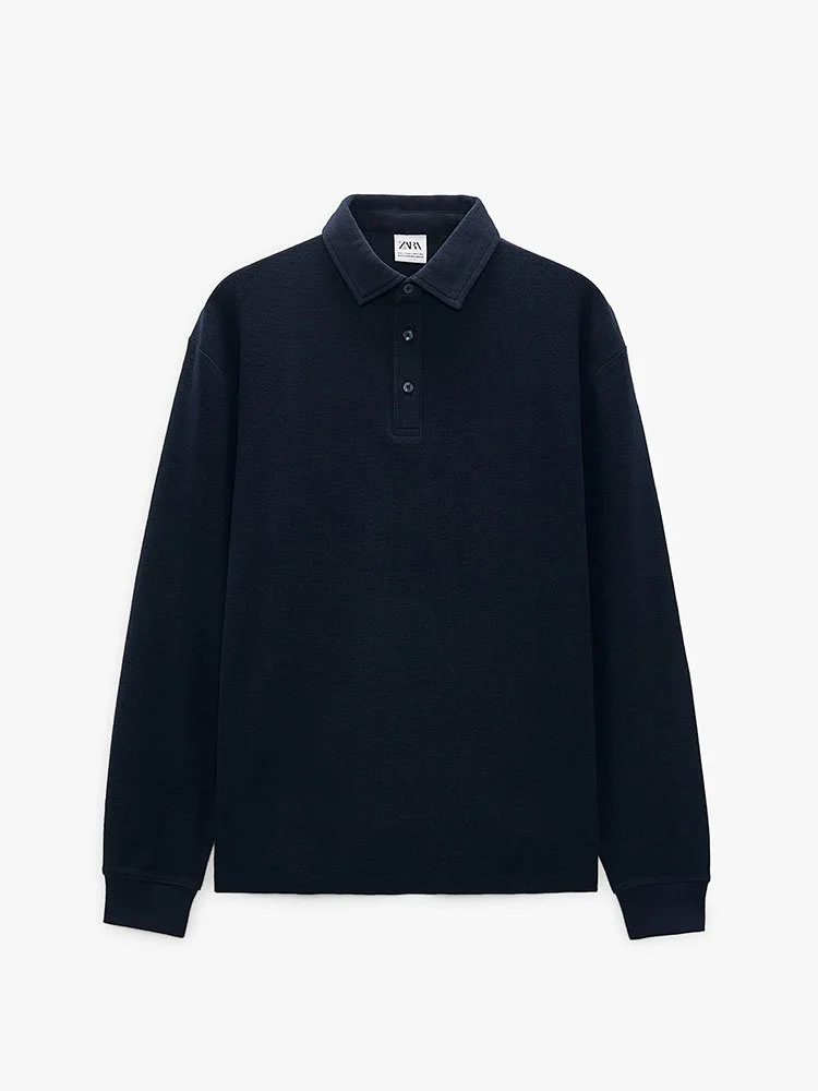Polo de cuello son solapa y cierre frontal de botones. Manga larga. Bajo con aberturas laterales.