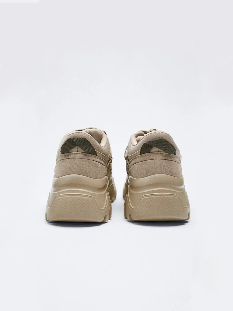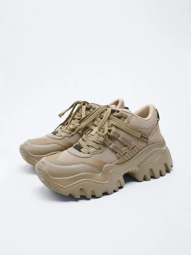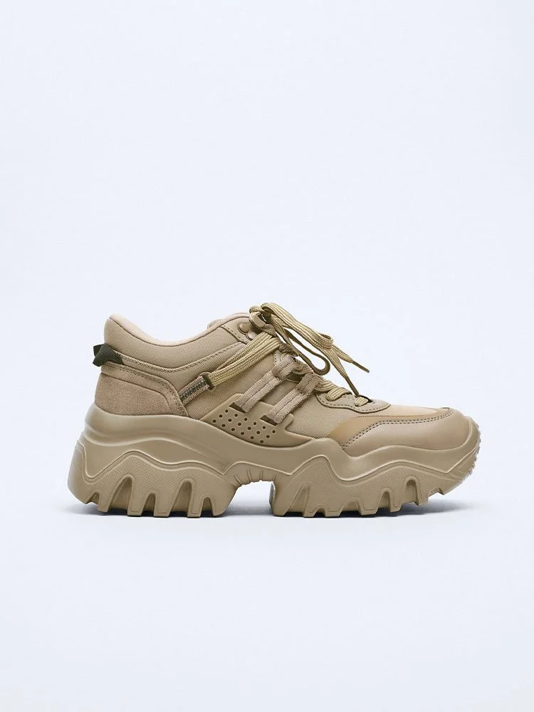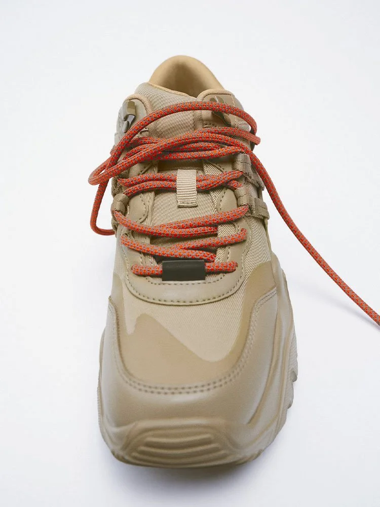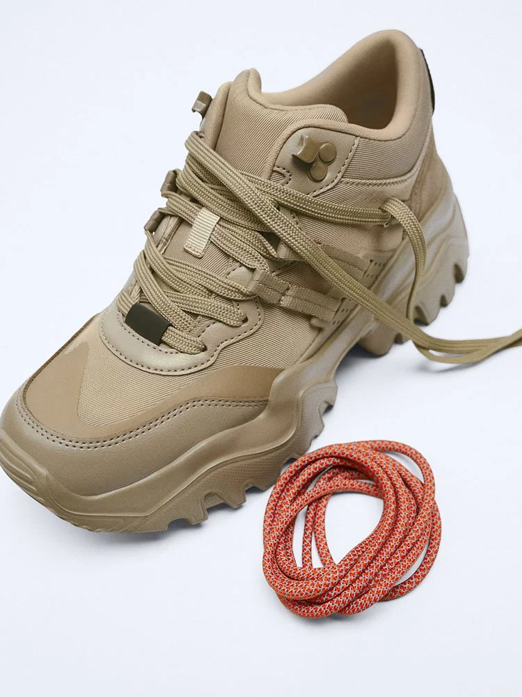 Deportivas monocromáticas. Suela de pista ancha y gruesa. Cierre con cordones. Viene con dos cordones de diferentes colores.