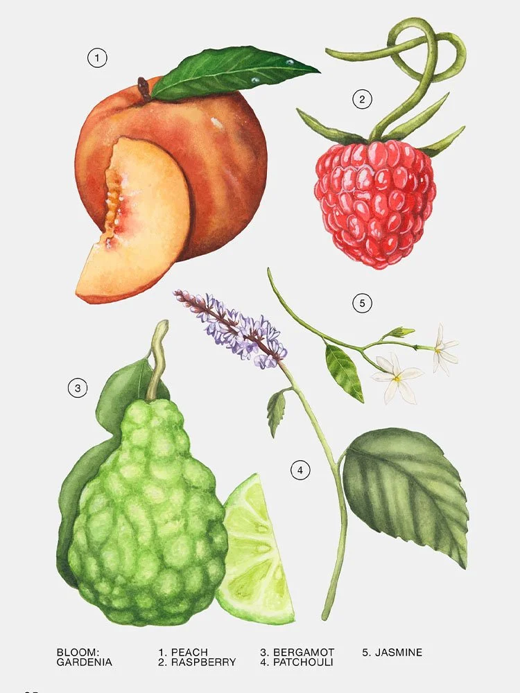 Fragancia apasionante de flor blanca envolvente y sedosa. La gardenia aporta voluptuosidad sobre la nota flor de naranjo y café, dentro de un universo afrutado de melocotón y frambuesa.