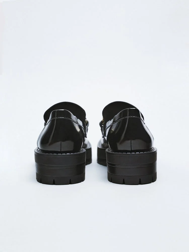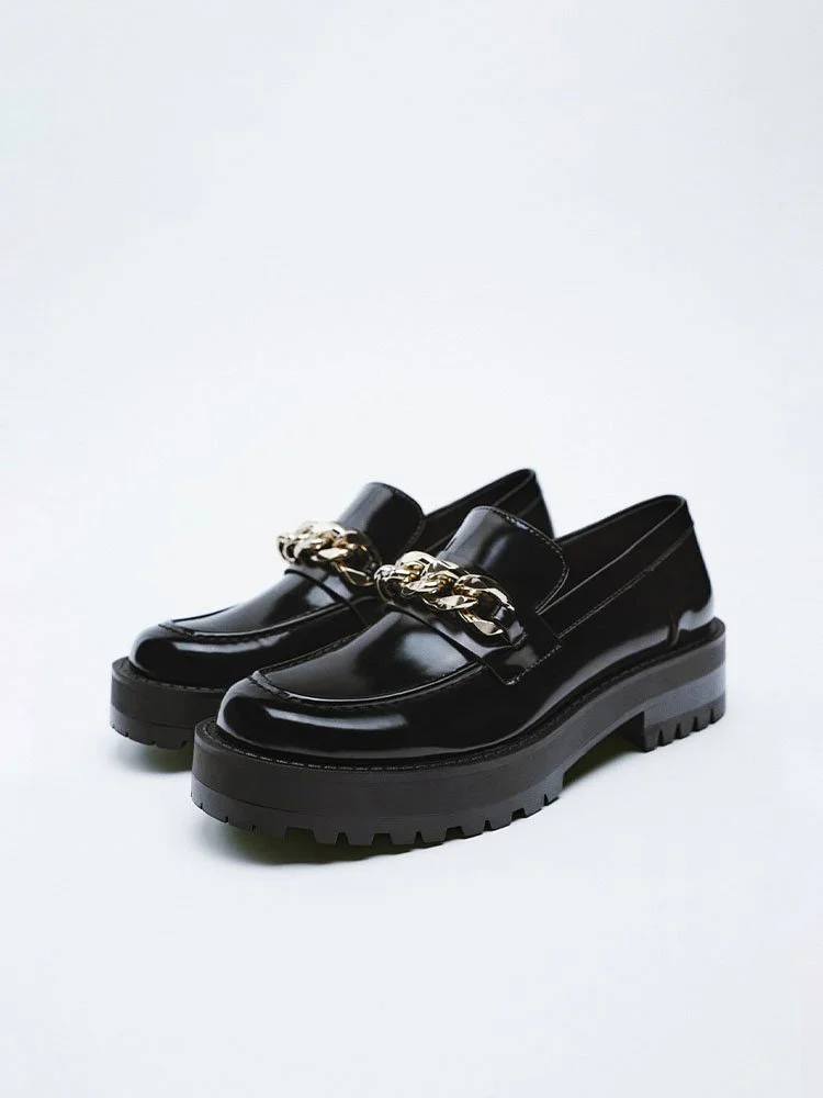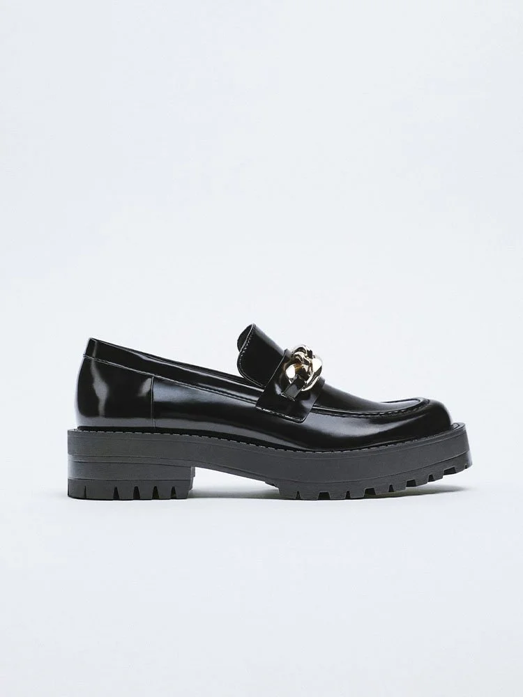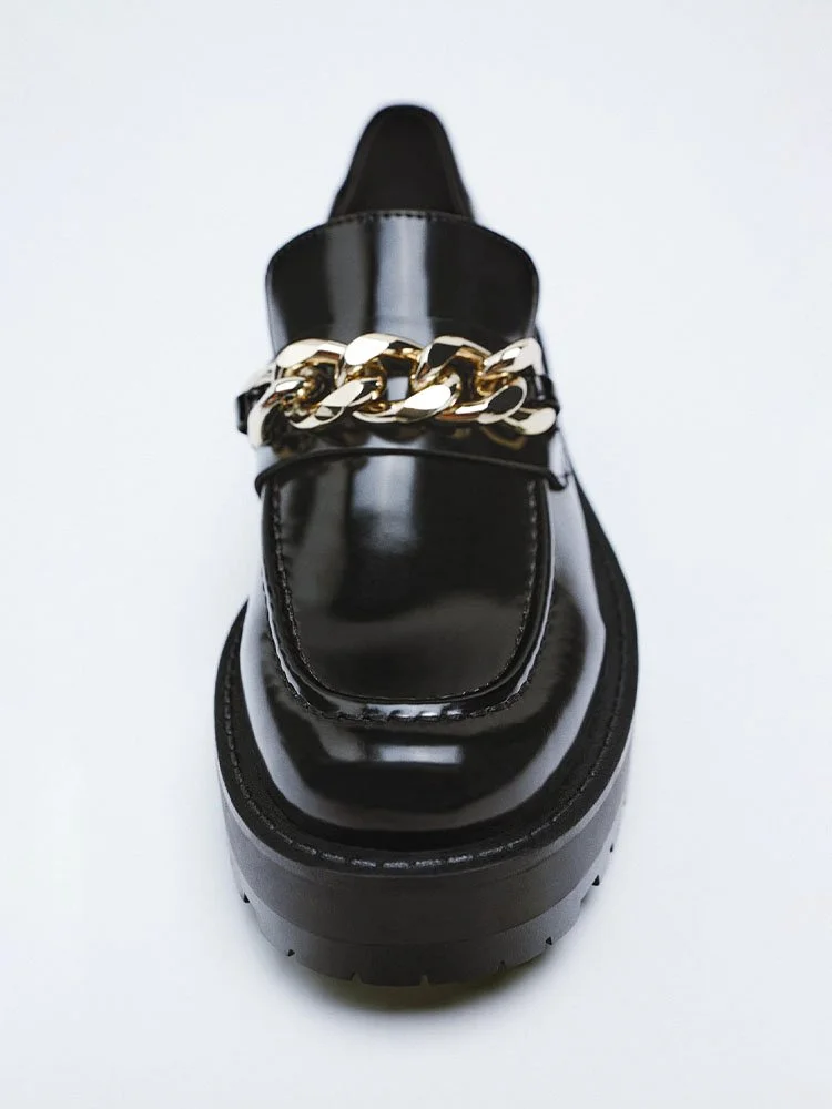 Zapato plano tipo mocasín. Detalle de cadena en la parte delantera. Piso ancho track dentado.