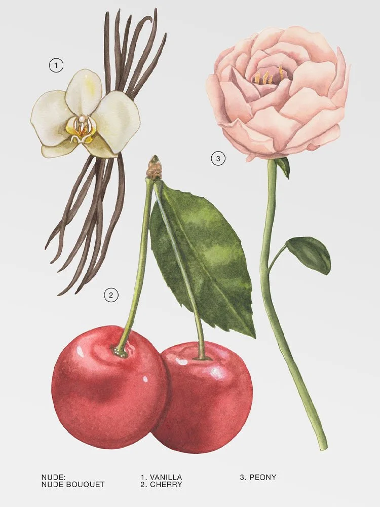 La pirámide olfativa incluye notas de cereza, peonía y vainilla. Es una fragancia fresca, acogedora y vibrante.