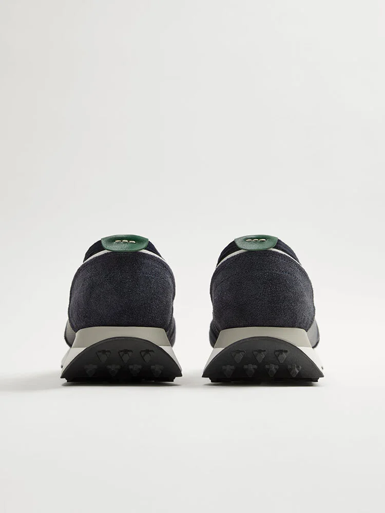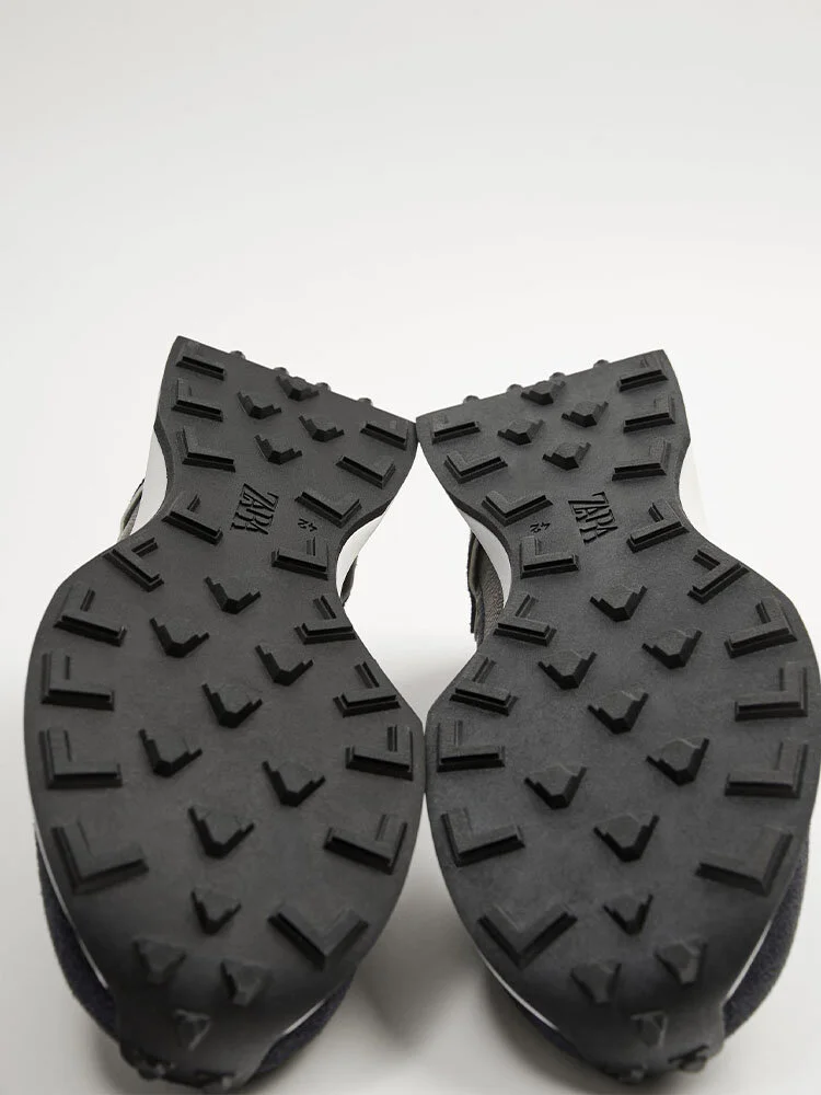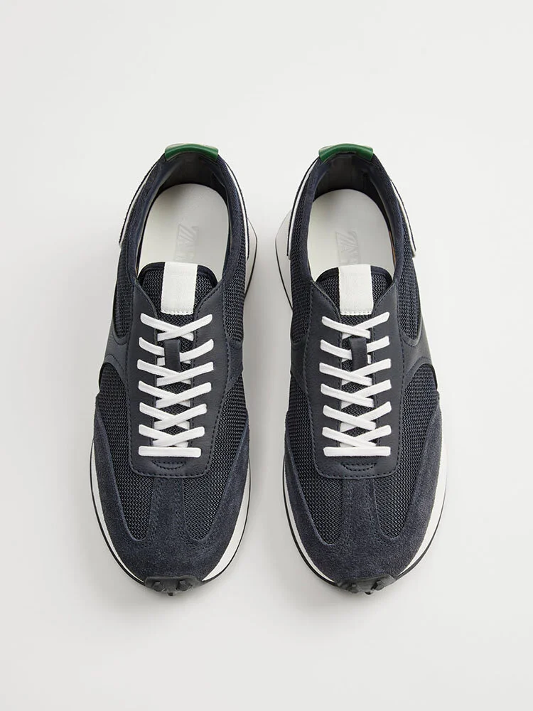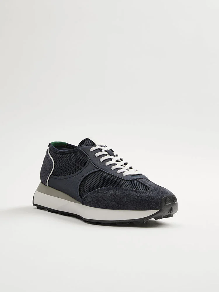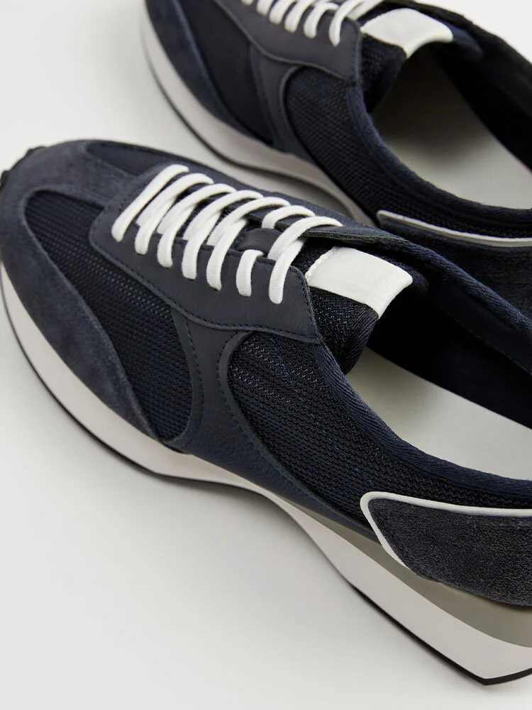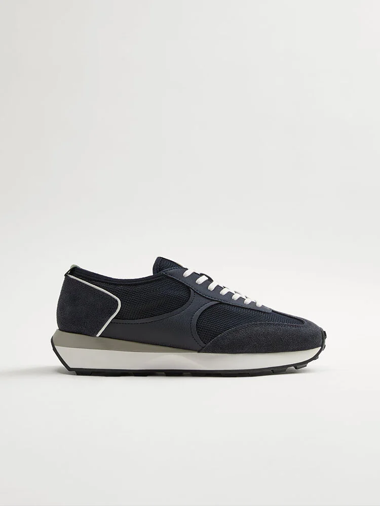Deportivo tipo running con superposición de materiales en el corte con piezas en piel. Cordonera con siete pasados. Suela blanca. Estilo retro.