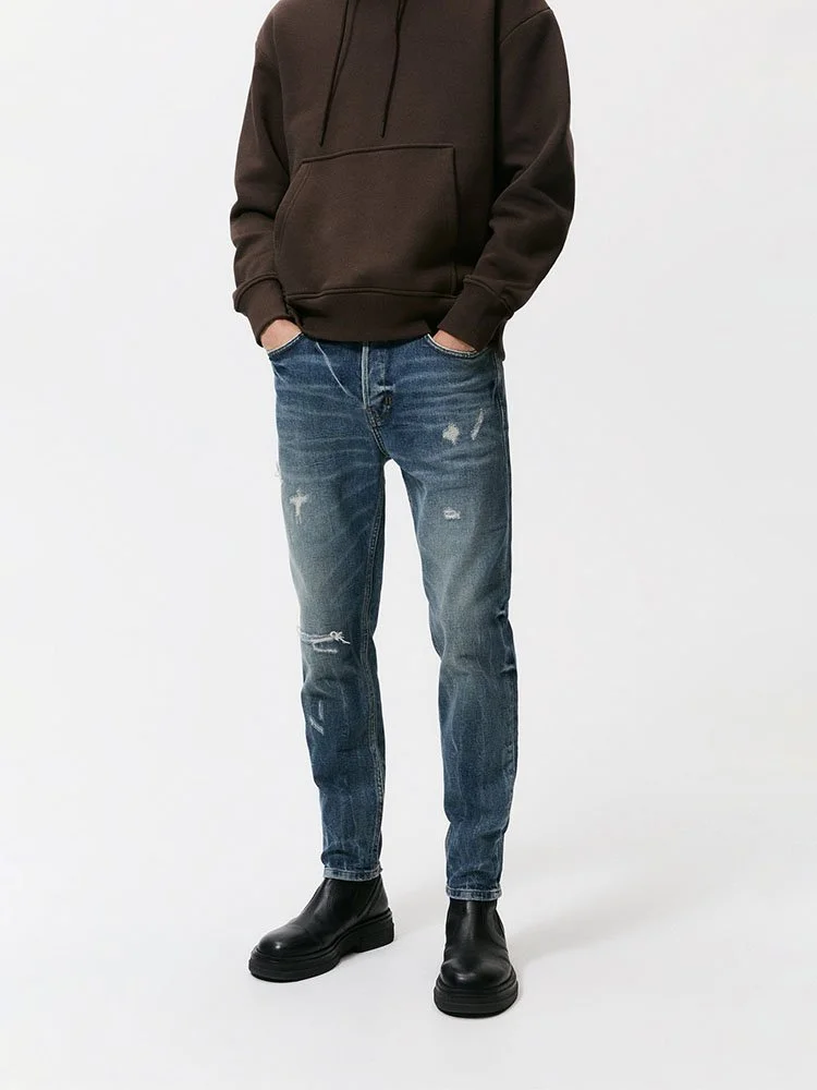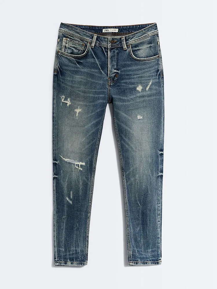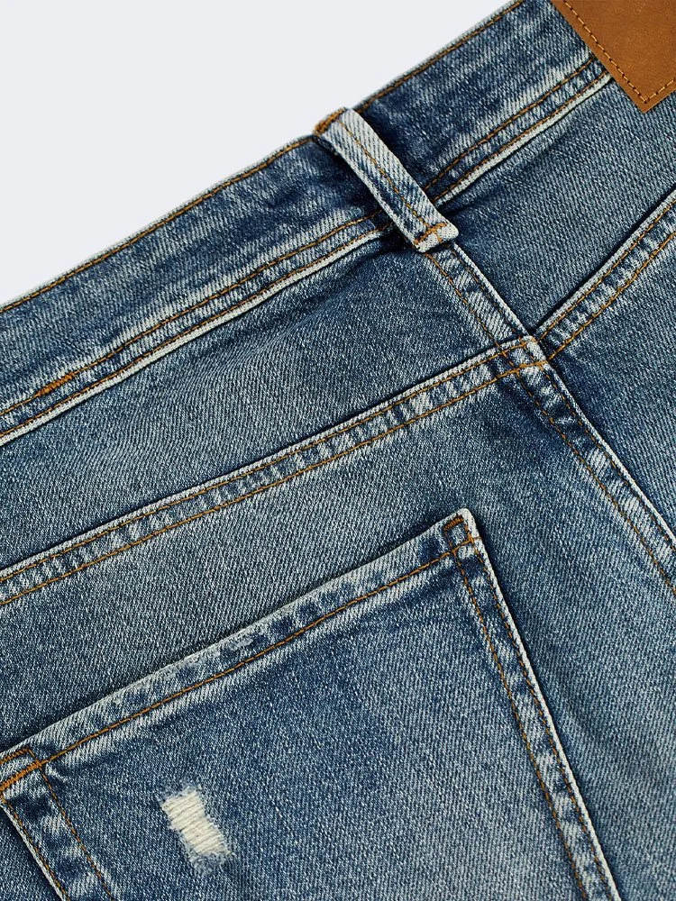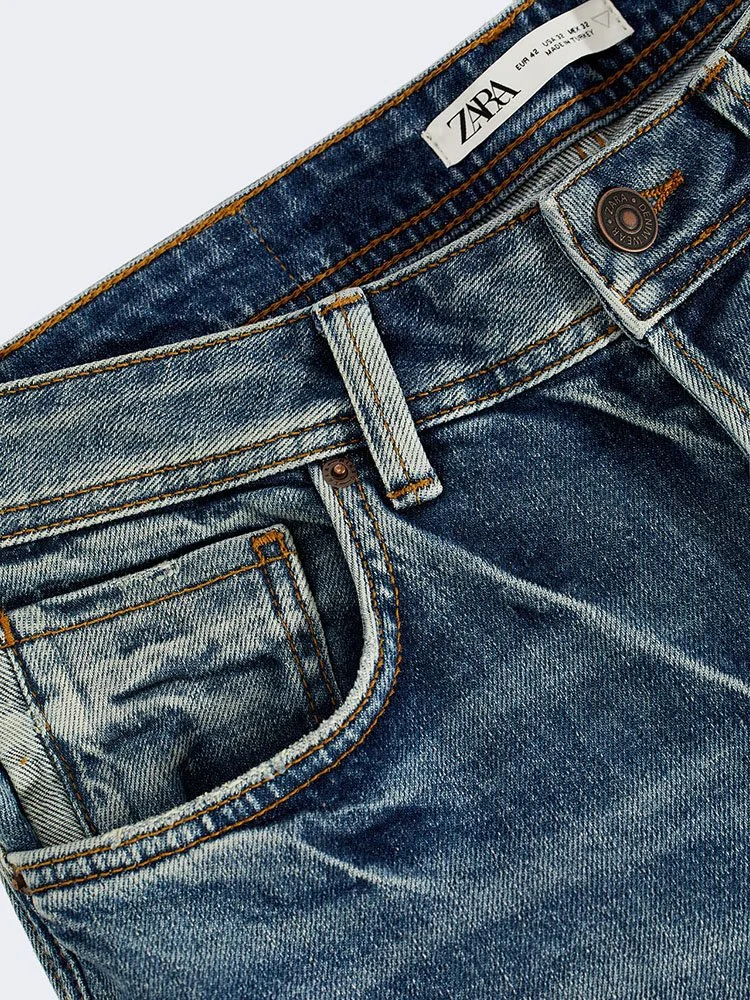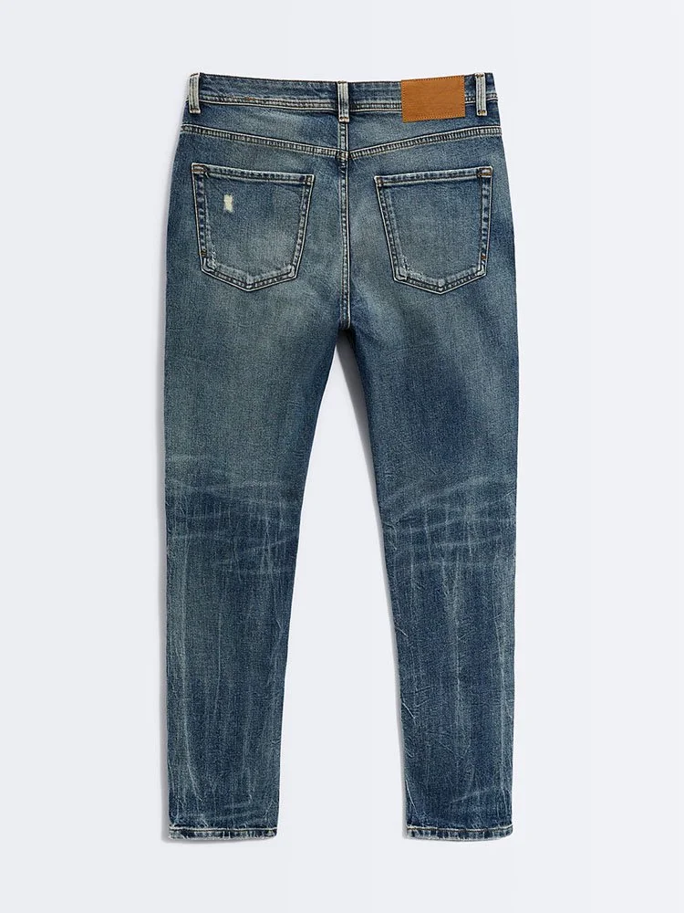 Jeans con cinco bolsillos y efecto de lavado. Cierre frontal con cremallera y botón.