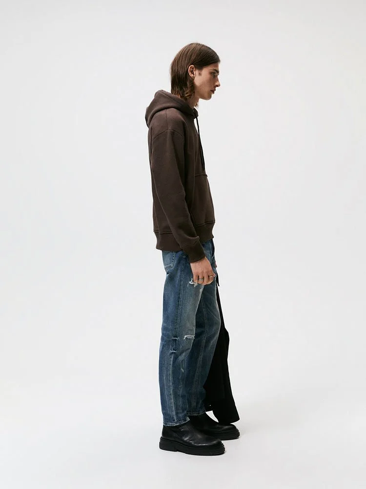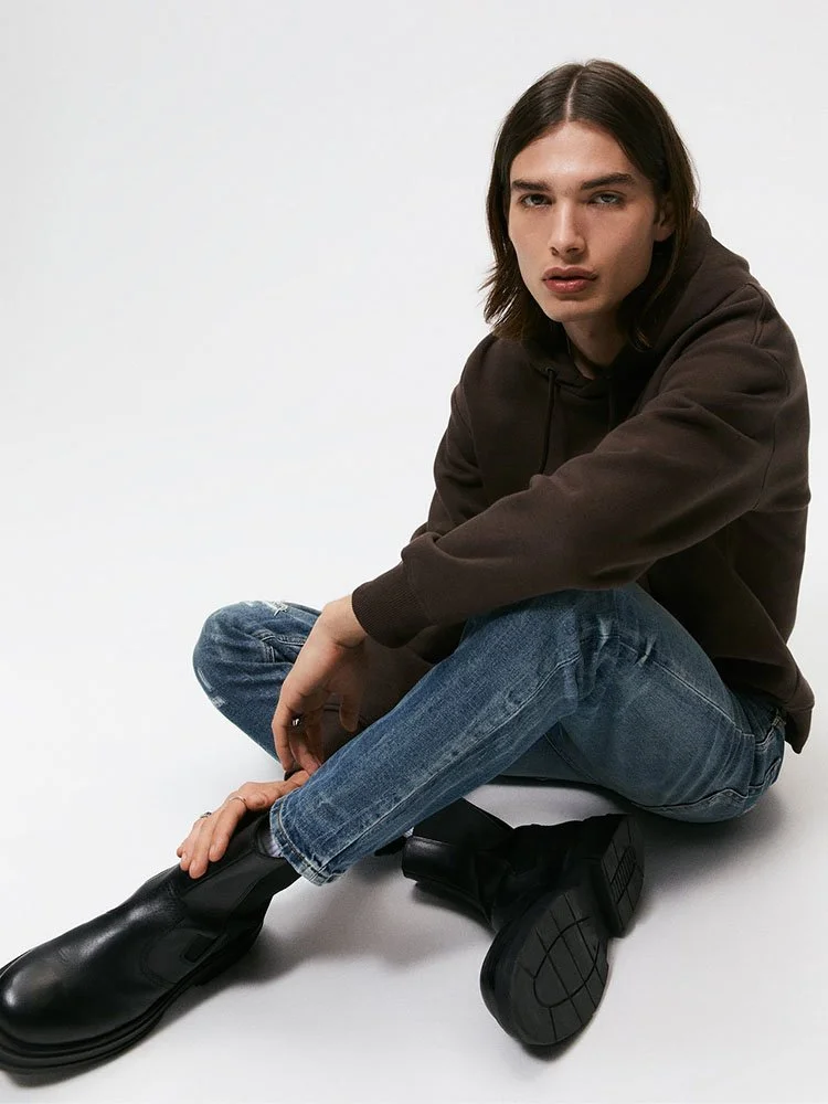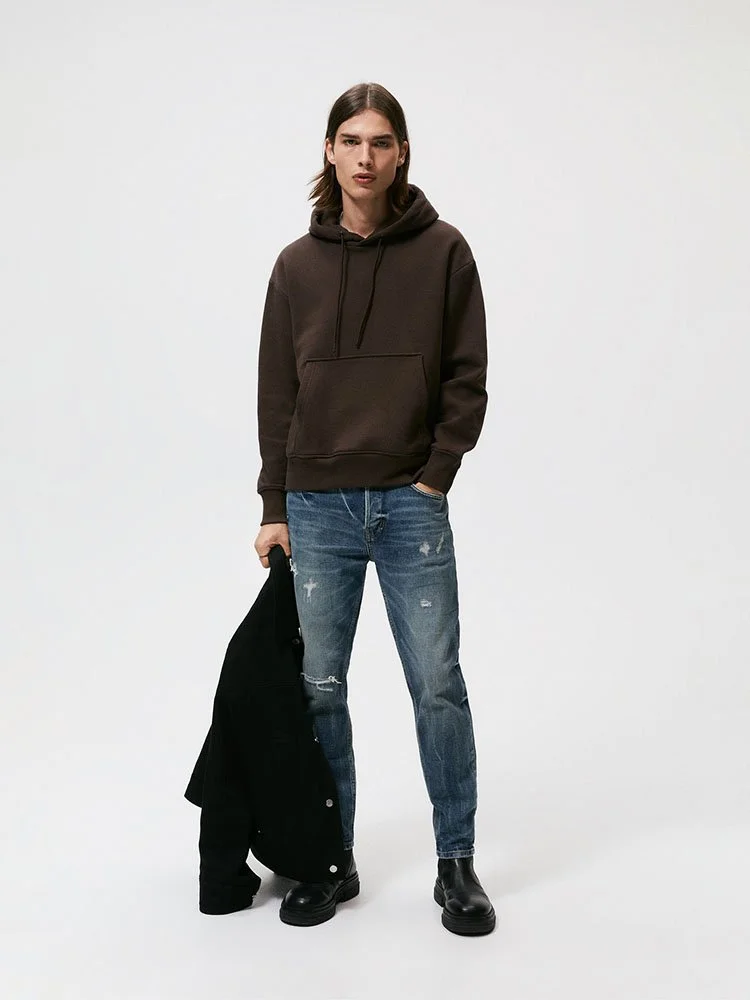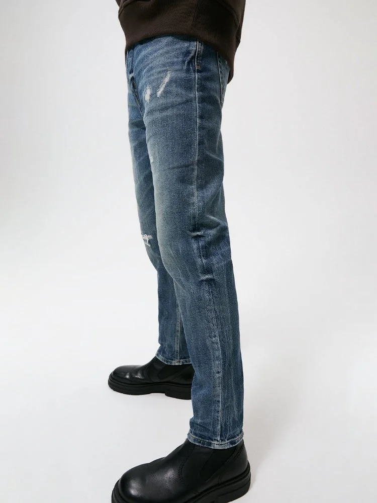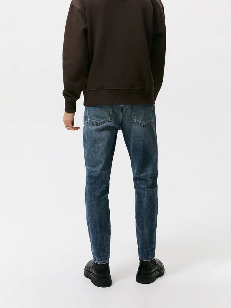 Jeans con cinco bolsillos y efecto de lavado. Cierre frontal con cremallera y botón.
